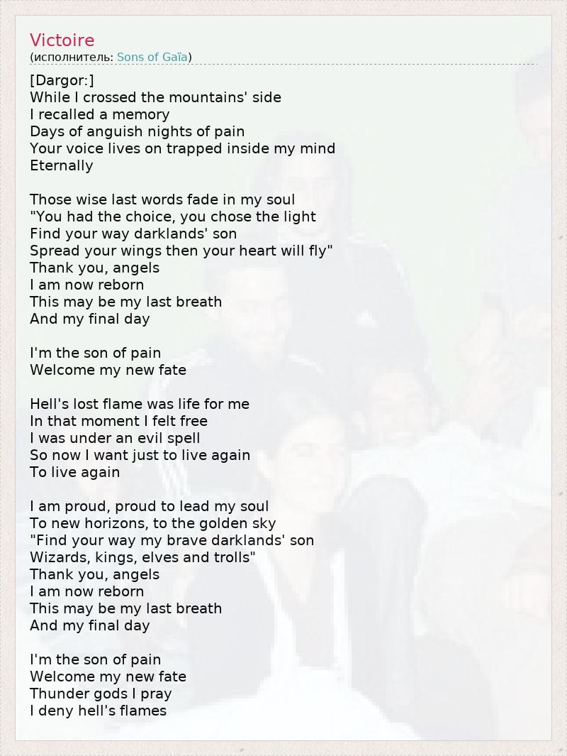 [Даргор:] Пока я пересекал черту гор, Я воскрешал в памяти Дни страдания, ночи боли. Твой голос вечно живет, запавший Мне в душу. Те мудрые последние слова делают сильнее мою душу: "У тебя был выбор, ты выбрал свет, Найди свой путь, сын темных земель, Расправь крылья, тогда твое сердце взлетит". Спасибо, ангелы, Я возродился. Может быть, это мой последний вдох И последний день. Я – сын боли, Добро пожаловать, моя новая судьба. Потерянное пламя ада было для меня жизнью, В тот миг я не колебался. Я был под злыми чарами, И теперь я хочу просто жить снова, Жить снова. Я горд, горд вести свою душу К новым горизонтам, к золотому небу. "Найдите свой путь - мой храбрый сын темных земель, Волшебники, короли, эльфы и тролли". Спасибо, ангелы, Я возродился. Может быть, это мой последний вдох И последний день. Я – сын боли, Добро пожаловать, моя новая судьба. Я молюсь богам грома И отвергаю огонь ада.