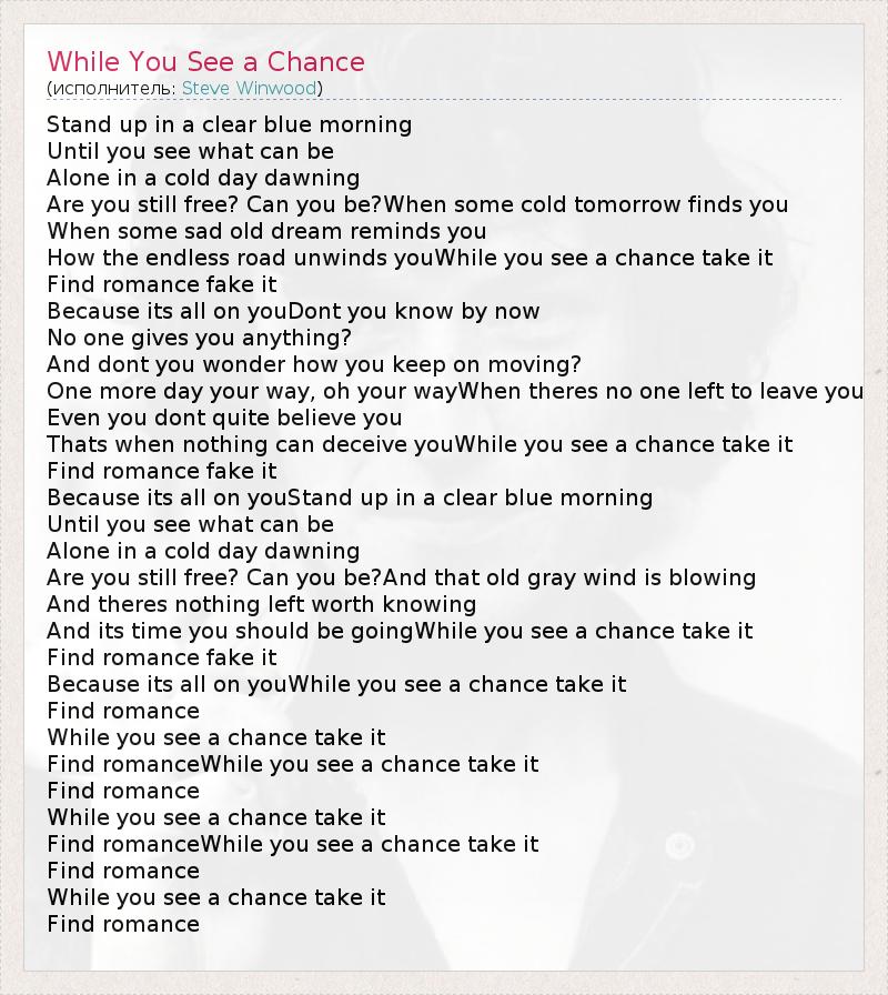 Stand up in a clear blue morning Until you see what can be Alone in a cold day dawning Are you still free? Can you be?When some cold tomorrow finds you When some sad old dream reminds you How the endless road unwinds youWhile you see a chance take it Find romance fake it Because its all on youDont you know by now No one gives you anything? And dont you wonder how you keep on moving? One more day your way, oh your wayWhen theres no one left to leave you Even you dont quite believe you Thats when nothing can deceive youWhile you see a chance take it Find romance fake it Because its all on youStand up in a clear blue morning Until you see what can be Alone in a cold day dawning Are you still free? Can you be?And that old gray wind is blowing And theres nothing left worth knowing And its time you should be goingWhile you see a chance take it Find romance fake it Because its all on youWhile you see a chance take it Find romance While you see a chance take it Find romanceWhile you see a chance take it Find romance While you see a chance take it Find romanceWhile you see a chance take it Find romance While you see a chance take it Find romance