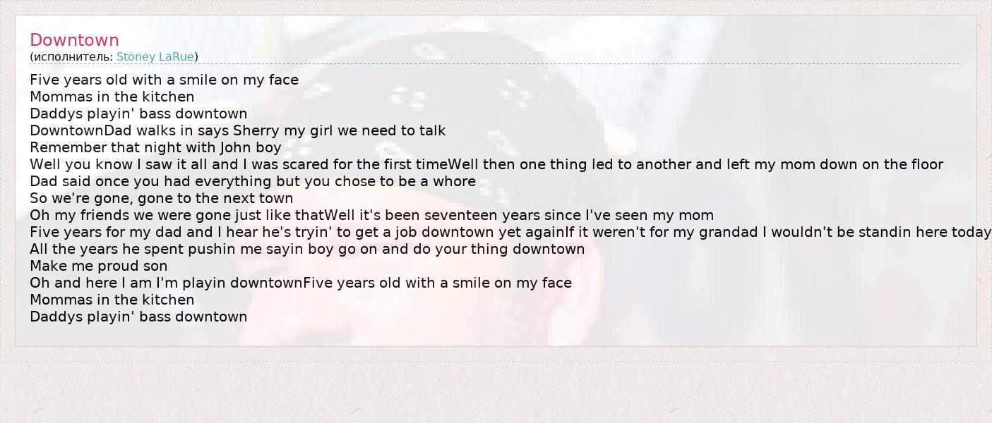 Five years old with a smile on my face Mommas in the kitchen Daddys playin' bass downtown DowntownDad walks in says Sherry my girl we need to talk Remember that night with John boy Well you know I saw it all and I was scared for the first timeWell then one thing led to another and left my mom down on the floor Dad said once you had everything but you chose to be a whore So we're gone, gone to the next town Oh my friends we were gone just like thatWell it's been seventeen years since I've seen my mom Five years for my dad and I hear he's tryin' to get a job downtown yet againIf it weren't for my grandad I wouldn't be standin here today All the years he spent pushin me sayin boy go on and do your thing downtown Make me proud son Oh and here I am I'm playin downtownFive years old with a smile on my face Mommas in the kitchen Daddys playin' bass downtown