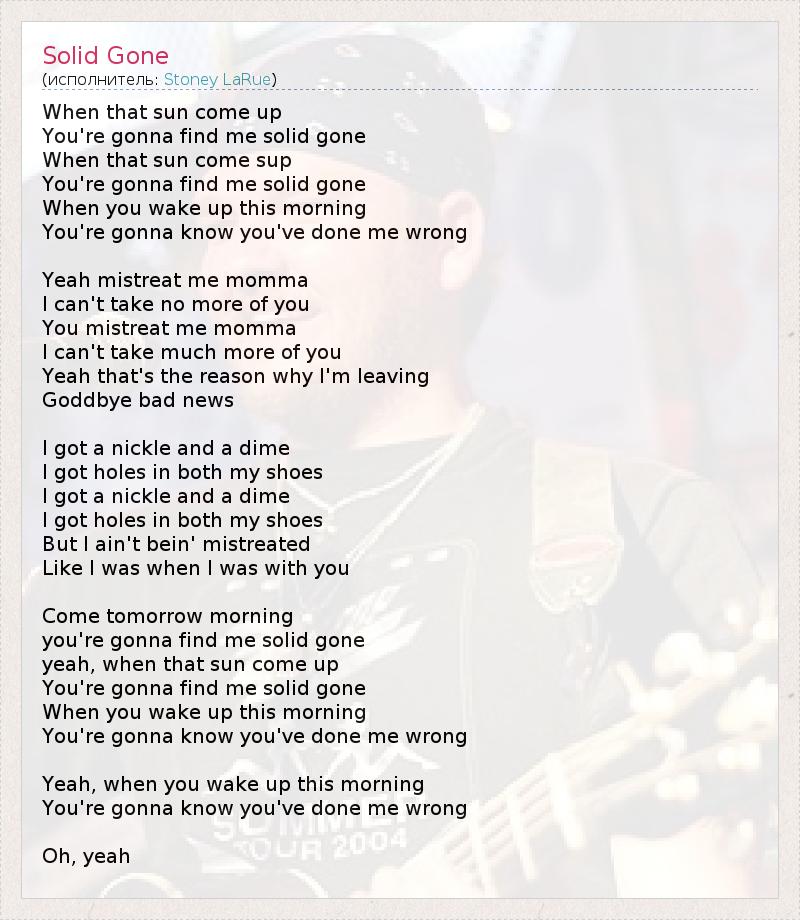 When that sun come up You're gonna find me solid gone When that sun come sup You're gonna find me solid gone When you wake up this morning You're gonna know you've done me wrong Yeah mistreat me momma I can't take no more of you You mistreat me momma I can't take much more of you Yeah that's the reason why I'm leaving Goddbye bad news I got a nickle and a dime I got holes in both my shoes I got a nickle and a dime I got holes in both my shoes But I ain't bein' mistreated Like I was when I was with you Come tomorrow morning you're gonna find me solid gone yeah, when that sun come up You're gonna find me solid gone When you wake up this morning You're gonna know you've done me wrong Yeah, when you wake up this morning You're gonna know you've done me wrong Oh, yeah