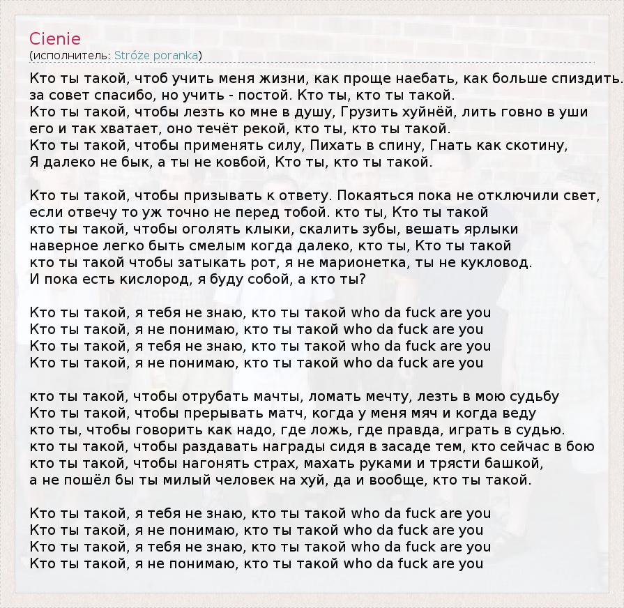 Кто ты такой, чтоб учить меня жизни, как проще наебать, как больше спиздить. за совет спасибо, но учить - постой. Кто ты, кто ты такой. Кто ты такой, чтобы лезть ко мне в душу, Грузить хуйнёй, лить говно в уши его и так хватает, оно течёт рекой, кто ты, кто ты такой. Кто ты такой, чтобы применять силу, Пихать в спину, Гнать как скотину, Я далеко не бык, а ты не ковбой, Кто ты, кто ты такой. Кто ты такой, чтобы призывать к ответу. Покаяться пока не отключили свет, если отвечу то уж точно не перед тобой. кто ты, Кто ты такой кто ты такой, чтобы оголять клыки, скалить зубы, вешать ярлыки наверное легко быть смелым когда далеко, кто ты, Кто ты такой кто ты такой чтобы затыкать рот, я не марионетка, ты не кукловод. И пока есть кислород, я буду собой, а кто ты? Кто ты такой, я тебя не знаю, кто ты такой who da fuck are you Кто ты такой, я не понимаю, кто ты такой who da fuck are you Кто ты такой, я тебя не знаю, кто ты такой who da fuck are you Кто ты такой, я не понимаю, кто ты такой who da fuck are you кто ты такой, чтобы отрубать мачты, ломать мечту, лезть в мою судьбу Кто ты такой, чтобы прерывать матч, когда у меня мяч и когда веду кто ты, чтобы говорить как надо, где ложь, где правда, играть в судью. кто ты такой, чтобы раздавать награды сидя в засаде тем, кто сейчас в бою кто ты такой, чтобы нагонять страх, махать руками и трясти башкой, а не пошёл бы ты милый человек на хуй, да и вообще, кто ты такой. Кто ты такой, я тебя не знаю, кто ты такой who da fuck are you Кто ты такой, я не понимаю, кто ты такой who da fuck are you Кто ты такой, я тебя не знаю, кто ты такой who da fuck are you Кто ты такой, я не понимаю, кто ты такой who da fuck are you