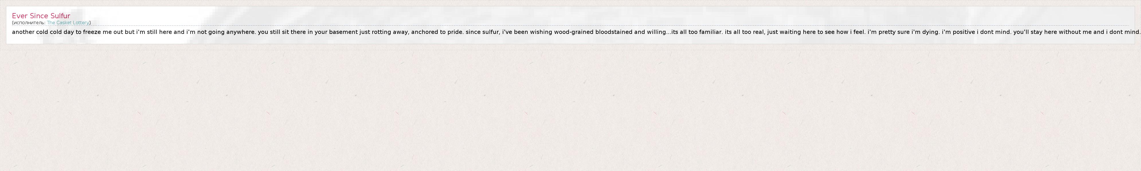 another cold cold day to freeze me out but i'm still here and i'm not going anywhere. you still sit there in your basement just rotting away, anchored to pride. since sulfur, i've been wishing wood-grained bloodstained and willing...its all too familiar. its all too real, just waiting here to see how i feel. i'm pretty sure i'm dying. i'm positive i dont mind. you'll stay here without me and i dont mind.