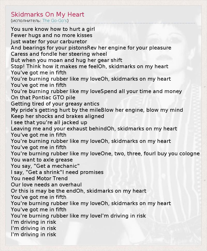 You sure know how to hurt a girl Fewer hugs and no more kisses Just water for your carburetor And bearings for your pistonsRev her engine for your pleasure Caress and fondle her steering wheel But when you moan and hug her gear shift Stop! Think how it makes me feelOh, skidmarks on my heart You've got me in fifth You're burning rubber like my loveOh, skidmarks on my heart You've got me in fifth You're burning rubber like my loveSpend all your time and money On that Pontiac GTO pile Getting tired of your greasy antics My pride's getting hurt by the mileBlow her engine, blow my mind Keep her shocks and brakes aligned I see that you're all jacked up Leaving me and your exhaust behindOh, skidmarks on my heart You've got me in fifth You're burning rubber like my loveOh, skidmarks on my heart You've got me in fifth You're burning rubber like my loveOne, two, three, fourI buy you cologne You want to axle grease You say, "Get a mechanic" I say, "Get a shrink"I need promises You need Motor Trend Our love needs an overhaul Or this is may be the endOh, skidmarks on my heart You've got me in fifth You're burning rubber like my loveOh, skidmarks on my heart You've got me in fifth You're burning rubber like my loveI'm driving in risk I'm driving in risk I'm driving in risk I'm driving in risk