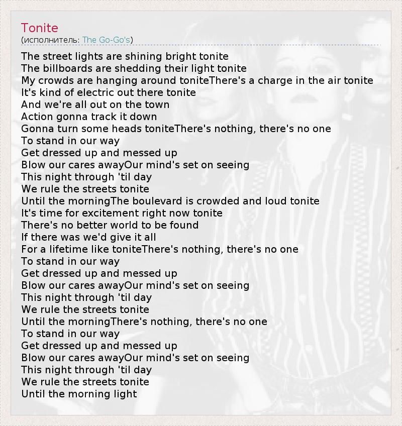 Это интересно:ГОУ-ГОУЗ (The Go-Go's) - американская пауэр-поп-группа. Была образована в 1978 году в Калифорнии. Первоначально группа называлась THE MISFITS. В ее состав входили только девушки: Белинда Карлайл (р. 16 августа 1958, Голливуд, Калифорния; ведущая вокалистка) и Джейн Уидлин (р. 20 мая 1958, Окономовок, Висконсин; ритм-гитара, вокал). К ним присоединились Шарлотта Кэффи (р. 21 октября 1953, Санта-Моника, Калифорния;... продолжение