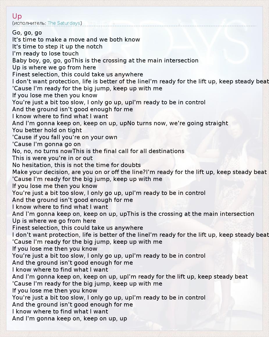 Go, go, go It's time to make a move and we both know It's time to step it up the notch I'm ready to lose touch Baby boy, go, go, goThis is the crossing at the main intersection Up is where we go from here Finest selection, this could take us anywhere I don't want protection, life is better of the lineI'm ready for the lift up, keep steady beat 'Cause I'm ready for the big jump, keep up with me If you lose me then you know You're just a bit too slow, I only go up, upI'm ready to be in control And the ground isn't good enough for me I know where to find what I want And I'm gonna keep on, keep on up, upNo turns now, we're going straight You better hold on tight 'Cause if you fall you're on your own 'Cause I'm gonna go on No, no, no turns nowThis is the final call for all destinations This is were you're in or out No hesitation, this is not the time for doubts Make your decision, are you on or off the line?I'm ready for the lift up, keep steady beat 'Cause I'm ready for the big jump, keep up with me If you lose me then you know You're just a bit too slow, I only go up, upI'm ready to be in control And the ground isn't good enough for me I know where to find what I want And I'm gonna keep on, keep on up, upThis is the crossing at the main intersection Up is where we go from here Finest selection, this could take us anywhere I don't want protection, life is better of the lineI'm ready for the lift up, keep steady beat 'Cause I'm ready for the big jump, keep up with me If you lose me then you know You're just a bit too slow, I only go up, upI'm ready to be in control And the ground isn't good enough for me I know where to find what I want And I'm gonna keep on, keep on up, upI'm ready for the lift up, keep steady beat 'Cause I'm ready for the big jump, keep up with me If you lose me then you know You're just a bit too slow, I only go up, upI'm ready to be in control And the ground isn't good enough for me I know where to find what I want And I'm gonna keep on, keep on up, up