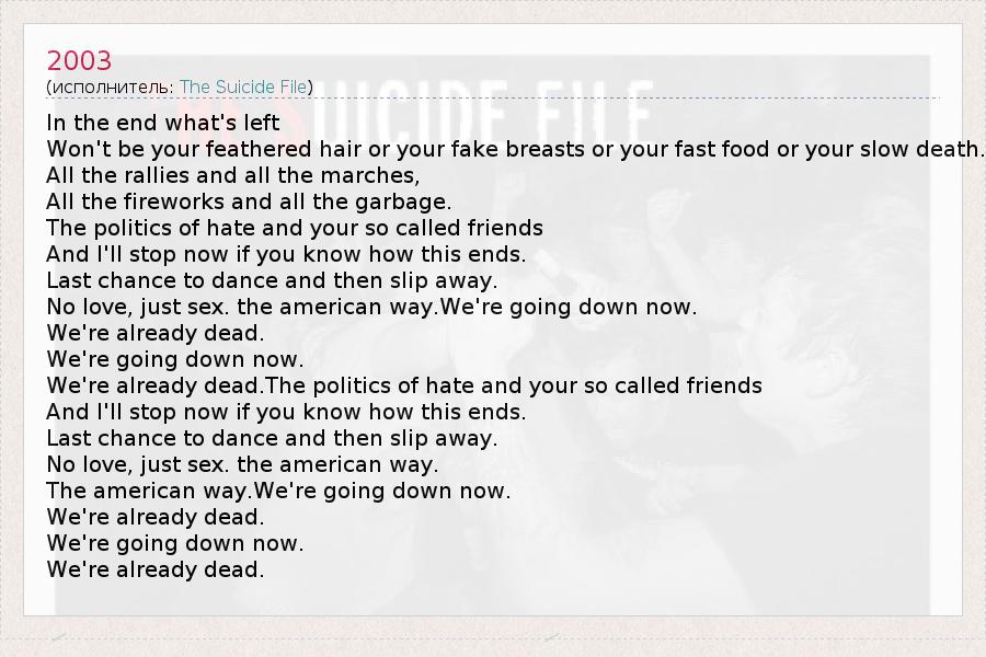 In the end what's left Won't be your feathered hair or your fake breasts or your fast food or your slow death. All the rallies and all the marches, All the fireworks and all the garbage. The politics of hate and your so called friends And I'll stop now if you know how this ends. Last chance to dance and then slip away. No love, just sex. the american way.We're going down now. We're already dead. We're going down now. We're already dead.The politics of hate and your so called friends And I'll stop now if you know how this ends. Last chance to dance and then slip away. No love, just sex. the american way. The american way.We're going down now. We're already dead. We're going down now. We're already dead.