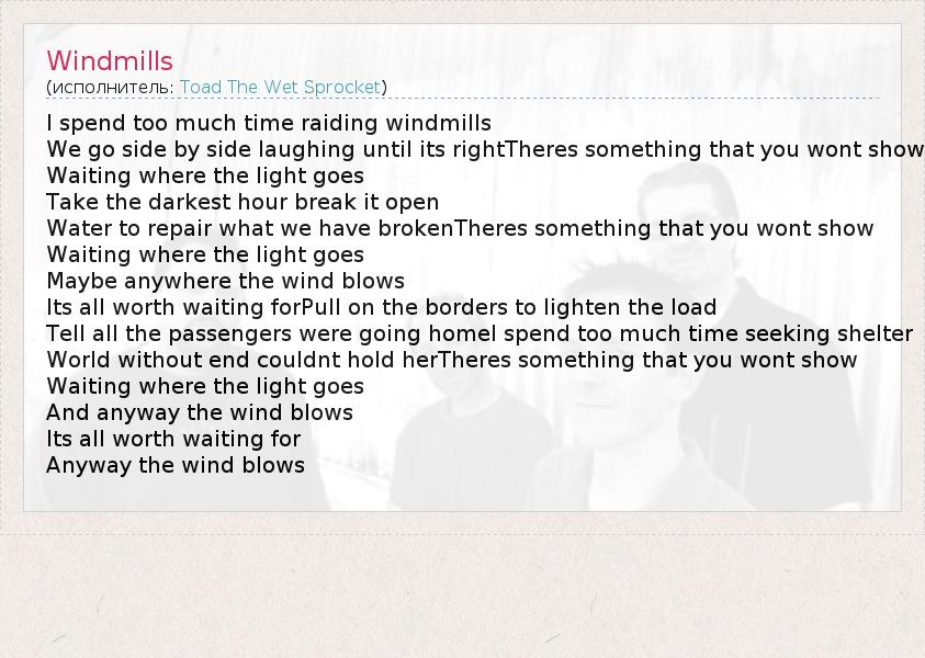 Это интересно:Toad the Wet Sprocket, американская альтернативная поп-рок-группа. Образована в 1986 в Санта-Барбаре, Калифорния. Группа была основана уроженцами Санта-Барбары, один из которых — Дин Диннинг — с рождения имел прямое отношение к музыке (его дядей был известный в 1950-е гг. «хит-мэйкер» Марк «Тин Энджел» Диннинг, Mark «Teen Angel» Dinning). После активных выступлений в городских барах, в 1988 группа записала демо-запись... продолжение