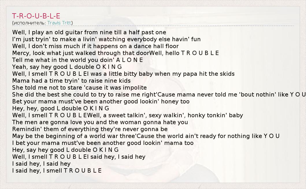 Well, I play an old guitar from nine till a half past one I'm just tryin' to make a livin' watching everybody else havin' fun Well, I don't miss much if it happens on a dance hall floor Mercy, look what just walked through that doorWell, hello T R O U B L E Tell me what in the world you doin' A L O N E Yeah, say hey good L double O K I N G Well, I smell T R O U B L EI was a little bitty baby when my papa hit the skids Mama had a time tryin' to raise nine kids She told me not to stare 'cause it was impolite She did the best she could to try to raise me right'Cause mama never told me 'bout nothin' like Y O U Bet your mama must've been another good lookin' honey too Hey, hey, good L double O K I N G Well, I smell T R O U B L EWell, a sweet talkin', sexy walkin', honky tonkin' baby The men are gonna love you and the woman gonna hate you Remindin' them of everything they're never gonna be May be the beginning of a world war three'Cause the world ain't ready for nothing like Y O U I bet your mama must've been another good lookin' mama too Hey, say hey good L double O K I N G Well, I smell T R O U B L EI said hey, I said hey I said hey, I said hey I said hey, I smell T R O U B L E
