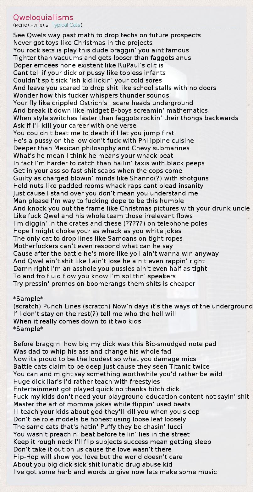 See Qwels way past math to drop techs on future prospects Never got toys like Christmas in the projects You rock sets is play this dude braggin' you aint famous Tighter than vacuums and gets looser than faggots anus Doper emcees none existent like RuPaul's clit is Cant tell if your dick or pussy like topless infants Couldn't spit sick 'ish kid lickin' your cold sores And leave you scared to drop shit like school stalls with no doors Wonder how this fucker whispers thunder sounds Your fly like crippled Ostrich's I scare heads underground And break it down like midget B-boys screamin' mathematics When style switches faster than faggots rockin' their thongs backwards Ask if I'll kill your career with one verse You couldn't beat me to death if I let you jump first He's a pussy on the low don't fuck with Philippine cuisine Deeper than Mexican philosophy and Chevy submarines What's he mean I think he means your whack beat In fact I'm harder to catch than hailin' taxis with black peeps Get in your ass so fast shit scabs when the cops come Guilty as charged blowin' minds like Shanno(?) with shotguns Hold nuts like padded rooms whack raps cant plead insanity Just cause I stand over you don't mean you understand me Man please I'm way to fucking dope to be this humble And knock you out the frame like Christmas pictures with your drunk uncle Like fuck Qwel and his whole team those irrelevant flows I'm diggin' in the crates and these (?????) on telephone poles Hope I might choke your as whack as you white jokes The only cat to drop lines like Samoans on tight ropes Motherfuckers can't even respond what can he say Cause after the battle he's more like yo I ain't wanna win anyway And Qwel ain't shit like I ain't lose he ain't even rappin' right Damn right I'm an asshole you pussies ain't even half as tight To and fro fluid flow you know I'm splittin' speakers Try pressin' promos on boomerangs them shits is cheaper *Sample* (scratch) Punch Lines (scratch) Now'n days it's the ways of the underground If I don't stay on the rest(?) tell me who the hell will When it really comes down to it two kids *Sample* Before braggin' how big my dick was this Bic-smudged note pad Was dad to whip his ass and change his whole fad Now its proud to be the loudest so what you damage mics Battle cats claim to be deep just cause they seen Titanic twice You can and might say something worthwhile you'd rather be wild Huge dick liar's I'd rather teach with freestyles Entertainment got played quick no thanks bitch dick Fuck my kids don't need your playground education content not sayin' shit Master the art of momma jokes while flippin' used beats Ill teach your kids about god they'll kill you when you sleep Don't be role models be honest using loose leaf loosely The same cats that's hatin' Puffy they be chasin' lucci You wasn't preachin' beat before tellin' lies in the street Keep it rough neck I'll flip subjects success mean getting sleep Don't take it out on us cause the love wasn't there Hip-Hop will show you love but the world doesn't care About you big dick sick shit lunatic drug abuse kid I've got some herb and words to give now lets make some music