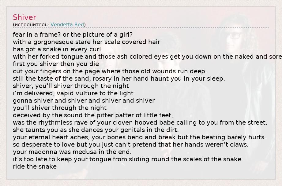 fear in a frame? or the picture of a girl? with a gorgonesque stare her scale covered hair has got a snake in every curl. with her forked tongue and those ash colored eyes get you down on the naked and sore first you shiver then you die cut your fingers on the page where those old wounds run deep. still the taste of the sand, rosary in her hand haunt you in your sleep. shiver, you'll shiver through the night i'm delivered, vapid vulture to the light gonna shiver and shiver and shiver and shiver you'll shiver through the night deceived by the sound the pitter patter of little feet, was the rhythmless rave of your cloven hooved babe calling to you from the street. she taunts you as she dances your genitals in the dirt. your eternal heart aches, your bones bend and break but the beating barely hurts. so desperate to love but you just can't pretend that her hands weren't claws. your madonna was medusa in the end. it's too late to keep your tongue from sliding round the scales of the snake. ride the snake