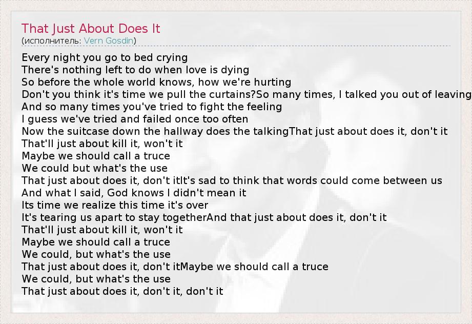 Every night you go to bed crying There's nothing left to do when love is dying So before the whole world knows, how we're hurting Don't you think it's time we pull the curtains?So many times, I talked you out of leaving And so many times you've tried to fight the feeling I guess we've tried and failed once too often Now the suitcase down the hallway does the talkingThat just about does it, don't it That'll just about kill it, won't it Maybe we should call a truce We could but what's the use That just about does it, don't itIt's sad to think that words could come between us And what I said, God knows I didn't mean it Its time we realize this time it's over It's tearing us apart to stay togetherAnd that just about does it, don't it That'll just about kill it, won't it Maybe we should call a truce We could, but what's the use That just about does it, don't itMaybe we should call a truce We could, but what's the use That just about does it, don't it, don't it