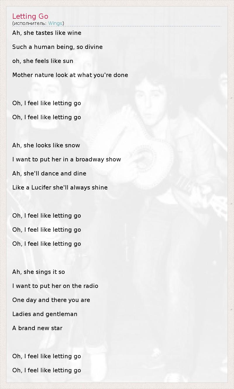 Ah, she tastes like wine Such a human being, so divine oh, she feels like sun Mother nature look at what you're done Oh, I feel like letting go Oh, I feel like letting go Ah, she looks like snow I want to put her in a broadway show Ah, she'll dance and dine Like a Lucifer she'll always shine Oh, I feel like letting go Oh, I feel like letting go Oh, I feel like letting go Ah, she sings it so I want to put her on the radio One day and there you are Ladies and gentleman A brand new star Oh, I feel like letting go Oh, I feel like letting go