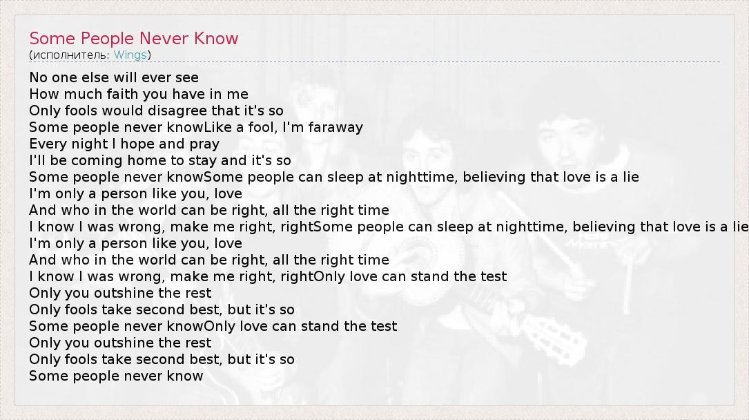 А как ты думаешь, о чем песня "Some People Never Know" ?
