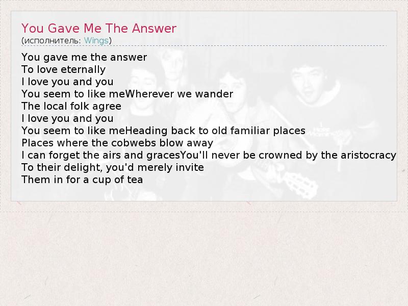 А как ты думаешь, о чем песня "You Gave Me The Answer" ?