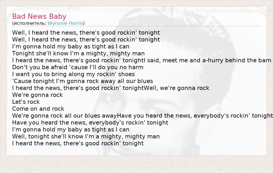 Well, I heard the news, there's good rockin' tonight Well, I heard the news, there's good rockin' tonight I'm gonna hold my baby as tight as I can Tonight she'll know I'm a mighty, mighty man I heard the news, there's good rockin' tonightI said, meet me and a-hurry behind the barn Don't you be afraid 'cause I'll do you no harm I want you to bring along my rockin' shoes 'Cause tonight I'm gonna rock away all our blues I heard the news, there's good rockin' tonightWell, we're gonna rock We're gonna rock Let's rock Come on and rock We're gonna rock all our blues awayHave you heard the news, everybody's rockin' tonight Have you heard the news, everybody's rockin' tonight I'm gonna hold my baby as tight as I can Well, tonight she'll know I'm a mighty, mighty man I heard the news, there's good rockin' tonight