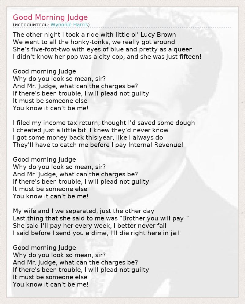 The other night I took a ride with little ol' Lucy Brown We went to all the honky-tonks, we really got around She's five-foot-two with eyes of blue and pretty as a queen I didn't know her pop was a city cop, and she was just fifteen! Good morning Judge Why do you look so mean, sir? And Mr. Judge, what can the charges be? If there's been trouble, I will plead not guilty It must be someone else You know it can't be me! I filed my income tax return, thought I'd saved some dough I cheated just a little bit, I knew they'd never know I got some money back this year, like I always do They'll have to catch me before I pay Internal Revenue! Good morning Judge Why do you look so mean, sir? And Mr. Judge, what can the charges be? If there's been trouble, I will plead not guilty It must be someone else You know it can't be me! My wife and I we separated, just the other day Last thing that she said to me was "Brother you will pay!" She said I'll pay her every week, I better never fail I said before I send you a dime, I'll die right here in jail! Good morning Judge Why do you look so mean, sir? And Mr. Judge, what can the charges be? If there's been trouble, I will plead not guilty It must be someone else You know it can't be me!