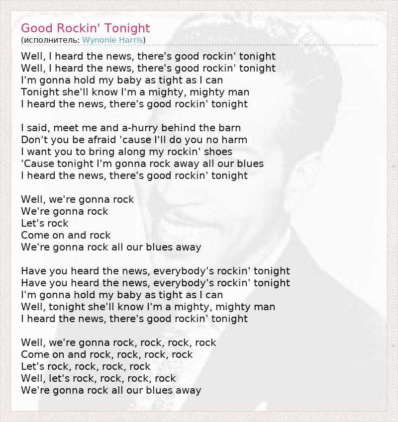 Well, I heard the news, there's good rockin' tonight Well, I heard the news, there's good rockin' tonight I'm gonna hold my baby as tight as I can Tonight she'll know I'm a mighty, mighty man I heard the news, there's good rockin' tonight I said, meet me and a-hurry behind the barn Don't you be afraid 'cause I'll do you no harm I want you to bring along my rockin' shoes 'Cause tonight I'm gonna rock away all our blues I heard the news, there's good rockin' tonight Well, we're gonna rock We're gonna rock Let's rock Come on and rock We're gonna rock all our blues away Have you heard the news, everybody's rockin' tonight Have you heard the news, everybody's rockin' tonight I'm gonna hold my baby as tight as I can Well, tonight she'll know I'm a mighty, mighty man I heard the news, there's good rockin' tonight Well, we're gonna rock, rock, rock, rock Come on and rock, rock, rock, rock Let's rock, rock, rock, rock Well, let's rock, rock, rock, rock We're gonna rock all our blues away