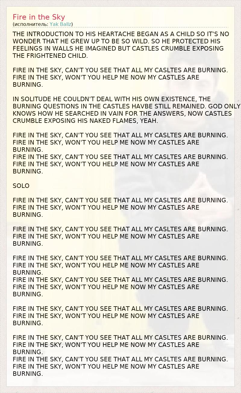 THE INTRODUCTION TO HIS HEARTACHE BEGAN AS A CHILD SO IT'S NO WONDER THAT HE GREW UP TO BE SO WILD. SO HE PROTECTED HIS FEELINGS IN WALLS HE IMAGINED BUT CASTLES CRUMBLE EXPOSING THE FRIGHTENED CHILD. FIRE IN THE SKY, CAN'T YOU SEE THAT ALL MY CASLTES ARE BURNING. FIRE IN THE SKY, WON'T YOU HELP ME NOW MY CASTLES ARE BURNING. IN SOLITUDE HE COULDN'T DEAL WITH HIS OWN EXISTENCE, THE BURNING QUESTIONS IN THE CASTLES HAVBE STILL REMAINED. GOD ONLY KNOWS HOW HE SEARCHED IN VAIN FOR THE ANSWERS, NOW CASTLES CRUMBLE EXPOSING HIS NAKED FLAMES, YEAH. FIRE IN THE SKY, CAN'T YOU SEE THAT ALL MY CASLTES ARE BURNING. FIRE IN THE SKY, WON'T YOU HELP ME NOW MY CASTLES ARE BURNING. FIRE IN THE SKY, CAN'T YOU SEE THAT ALL MY CASLTES ARE BURNING. FIRE IN THE SKY, WON'T YOU HELP ME NOW MY CASTLES ARE BURNING. SOLO FIRE IN THE SKY, CAN'T YOU SEE THAT ALL MY CASLTES ARE BURNING. FIRE IN THE SKY, WON'T YOU HELP ME NOW MY CASTLES ARE BURNING. FIRE IN THE SKY, CAN'T YOU SEE THAT ALL MY CASLTES ARE BURNING. FIRE IN THE SKY, WON'T YOU HELP ME NOW MY CASTLES ARE BURNING. FIRE IN THE SKY, CAN'T YOU SEE THAT ALL MY CASLTES ARE BURNING. FIRE IN THE SKY, WON'T YOU HELP ME NOW MY CASTLES ARE BURNING. FIRE IN THE SKY, CAN'T YOU SEE THAT ALL MY CASLTES ARE BURNING. FIRE IN THE SKY, WON'T YOU HELP ME NOW MY CASTLES ARE BURNING. FIRE IN THE SKY, CAN'T YOU SEE THAT ALL MY CASLTES ARE BURNING. FIRE IN THE SKY, WON'T YOU HELP ME NOW MY CASTLES ARE BURNING. FIRE IN THE SKY, CAN'T YOU SEE THAT ALL MY CASLTES ARE BURNING. FIRE IN THE SKY, WON'T YOU HELP ME NOW MY CASTLES ARE BURNING. FIRE IN THE SKY, CAN'T YOU SEE THAT ALL MY CASLTES ARE BURNING. FIRE IN THE SKY, WON'T YOU HELP ME NOW MY CASTLES ARE BURNING.