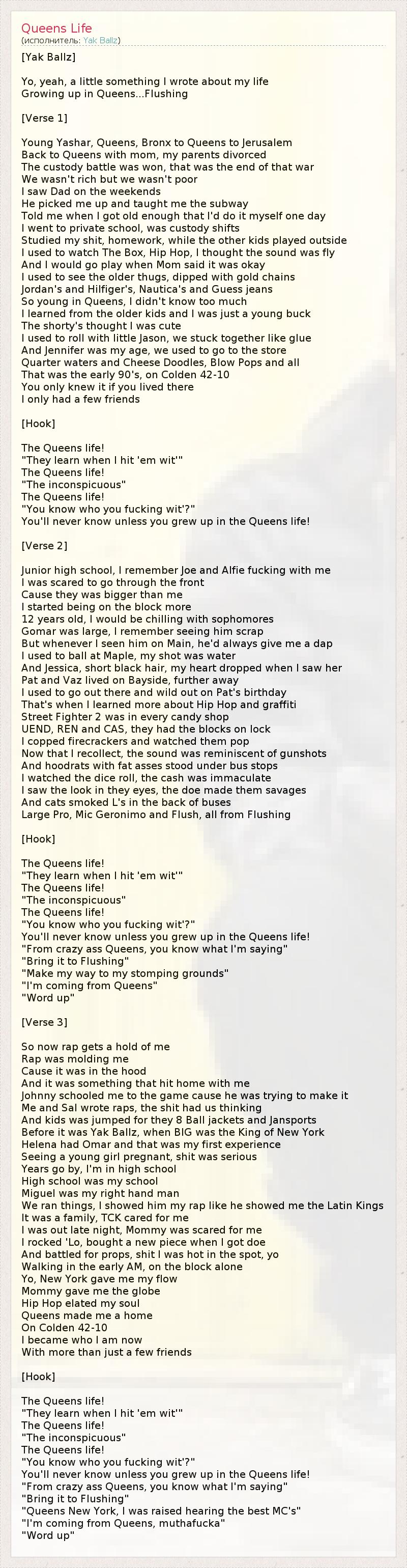 [Yak Ballz] Yo, yeah, a little something I wrote about my life Growing up in Queens...Flushing [Verse 1] Young Yashar, Queens, Bronx to Queens to Jerusalem Back to Queens with mom, my parents divorced The custody battle was won, that was the end of that war We wasn't rich but we wasn't poor I saw Dad on the weekends He picked me up and taught me the subway Told me when I got old enough that I'd do it myself one day I went to private school, was custody shifts Studied my shit, homework, while the other kids played outside I used to watch The Box, Hip Hop, I thought the sound was fly And I would go play when Mom said it was okay I used to see the older thugs, dipped with gold chains Jordan's and Hilfiger's, Nautica's and Guess jeans So young in Queens, I didn't know too much I learned from the older kids and I was just a young buck The shorty's thought I was cute I used to roll with little Jason, we stuck together like glue And Jennifer was my age, we used to go to the store Quarter waters and Cheese Doodles, Blow Pops and all That was the early 90's, on Colden 42-10 You only knew it if you lived there I only had a few friends [Hook] The Queens life! "They learn when I hit 'em wit'" The Queens life! "The inconspicuous" The Queens life! "You know who you fucking wit'?" You'll never know unless you grew up in the Queens life! [Verse 2] Junior high school, I remember Joe and Alfie fucking with me I was scared to go through the front Cause they was bigger than me I started being on the block more 12 years old, I would be chilling with sophomores Gomar was large, I remember seeing him scrap But whenever I seen him on Main, he'd always give me a dap I used to ball at Maple, my shot was water And Jessica, short black hair, my heart dropped when I saw her Pat and Vaz lived on Bayside, further away I used to go out there and wild out on Pat's birthday That's when I learned more about Hip Hop and graffiti Street Fighter 2 was in every candy shop UEND, REN and CAS, they had the blocks on lock I copped firecrackers and watched them pop Now that I recollect, the sound was reminiscent of gunshots And hoodrats with fat asses stood under bus stops I watched the dice roll, the cash was immaculate I saw the look in they eyes, the doe made them savages And cats smoked L's in the back of buses Large Pro, Mic Geronimo and Flush, all from Flushing [Hook] The Queens life! "They learn when I hit 'em wit'" The Queens life! "The inconspicuous" The Queens life! "You know who you fucking wit'?" You'll never know unless you grew up in the Queens life! "From crazy ass Queens, you know what I'm saying" "Bring it to Flushing" "Make my way to my stomping grounds" "I'm coming from Queens" "Word up" [Verse 3] So now rap gets a hold of me Rap was molding me Cause it was in the hood And it was something that hit home with me Johnny schooled me to the game cause he was trying to make it Me and Sal wrote raps, the shit had us thinking And kids was jumped for they 8 Ball jackets and Jansports Before it was Yak Ballz, when BIG was the King of New York Helena had Omar and that was my first experience Seeing a young girl pregnant, shit was serious Years go by, I'm in high school High school was my school Miguel was my right hand man We ran things, I showed him my rap like he showed me the Latin Kings It was a family, TCK cared for me I was out late night, Mommy was scared for me I rocked 'Lo, bought a new piece when I got doe And battled for props, shit I was hot in the spot, yo Walking in the early AM, on the block alone Yo, New York gave me my flow Mommy gave me the globe Hip Hop elated my soul Queens made me a home On Colden 42-10 I became who I am now With more than just a few friends [Hook] The Queens life! "They learn when I hit 'em wit'" The Queens life! "The inconspicuous" The Queens life! "You know who you fucking wit'?" You'll never know unless you grew up in the Queens life! "From crazy ass Queens, you know what I'm saying" "Bring it to Flushing" "Queens New York, I was raised hearing the best MC's" "I'm coming from Queens, muthafucka" "Word up"
