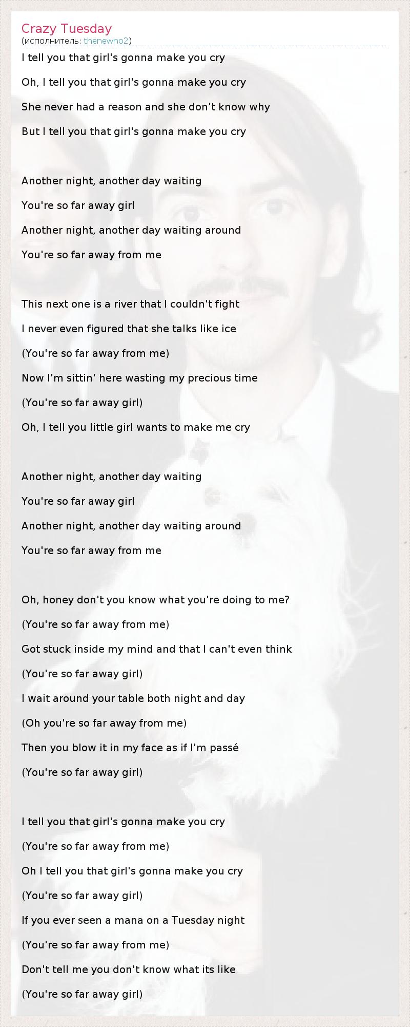 I tell you that girl's gonna make you cry Oh, I tell you that girl's gonna make you cry She never had a reason and she don't know why But I tell you that girl's gonna make you cry Another night, another day waiting You're so far away girl Another night, another day waiting around You're so far away from me This next one is a river that I couldn't fight I never even figured that she talks like ice (You're so far away from me) Now I'm sittin' here wasting my precious time (You're so far away girl) Oh, I tell you little girl wants to make me cry Another night, another day waiting You're so far away girl Another night, another day waiting around You're so far away from me Oh, honey don't you know what you're doing to me? (You're so far away from me) Got stuck inside my mind and that I can't even think (You're so far away girl) I wait around your table both night and day (Oh you're so far away from me) Then you blow it in my face as if I'm passé (You're so far away girl) I tell you that girl's gonna make you cry (You're so far away from me) Oh I tell you that girl's gonna make you cry (You're so far away girl) If you ever seen a mana on a Tuesday night (You're so far away from me) Don't tell me you don't know what its like (You're so far away girl)