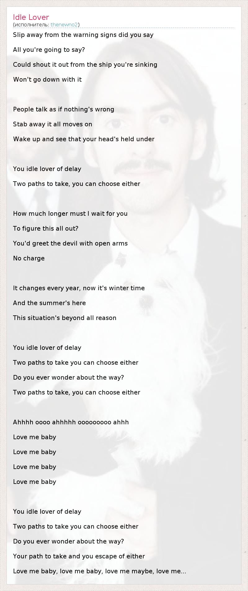 Slip away from the warning signs did you say All you're going to say? Could shout it out from the ship you're sinking Won't go down with it People talk as if nothing's wrong Stab away it all moves on Wake up and see that your head's held under You idle lover of delay Two paths to take, you can choose either How much longer must I wait for you To figure this all out? You'd greet the devil with open arms No charge It changes every year, now it's winter time And the summer's here This situation's beyond all reason You idle lover of delay Two paths to take you can choose either Do you ever wonder about the way? Two paths to take, you can choose either Ahhhh oooo ahhhhh ooooooooo ahhh Love me baby Love me baby Love me baby Love me baby You idle lover of delay Two paths to take you can choose either Do you ever wonder about the way? Your path to take and you escape of either Love me baby, love me baby, love me maybe, love me...