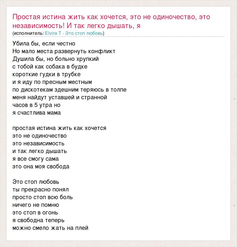 Убила бы, если честно Но мало места развернуть конфликт Душила бы, но больно хрупкий с тобой как собака в будке короткие гудки в трубке и я иду по пресным местным по дискотекам здешним теряюсь в толпе меня найдут уставшей и странной часов в 5 утра но я счастлива мама простая истина жить как хочется это не одиночество это независимость и так легко дышать я все смогу сама это она моя свобода Это стоп любовь ты прекрасно понял просто стоп всю боль ничего не помню это стоп в огонь я свободна теперь можно смело жать на плей