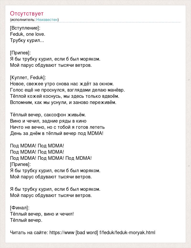 [Вступление]: Feduk, one love. Трубку курил... [Припев]: Я бы трубку курил, если б был моряком. Мой парус обдувают тысячи ветров. [Куплет, Feduk]: Новое, свежее утро снова нас ждёт за окном. Голос ещё не проснулся, взглядами делаю манёвр. Тёплой кожей коснусь, мы здесь только вдвоём. Вспомним, как мы уснули, и заново переживём. Тёплый вечер, саксофон живьём. Вино и чечил, задние ряды в кино Ничто не вечно, но с тобой я готов лететь День за днём в тёплый вечер под MDMA! Под MDMA! Под MDMA! Под MDMA! Под MDMA! Под MDMA! Под MDMA! Под MDMA! [Припев]: Я бы трубку курил, если б был моряком. Мой парус обдувают тысячи ветров. Я бы трубку курил, если б был моряком. Мой парус обдувают тысячи ветров. [Финал]: Тёплый вечер, вино и чечил! Тёплый вечер. Читать на сайте: https://www [bad word] f/feduk/feduk-moryak.html
