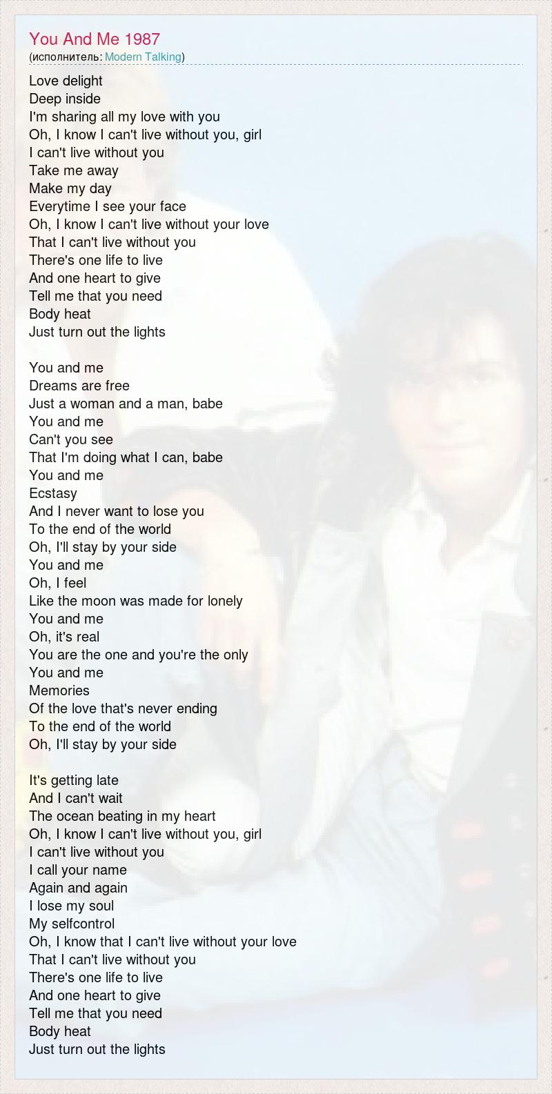 Love delight Deep inside I'm sharing all my love with you Oh, I know I can't live without you, girl I can't live without you Take me away Make my day Everytime I see your face Oh, I know I can't live without your love That I can't live without you There's one life to live And one heart to give Tell me that you need Body heat Just turn out the lights You and me Dreams are free Just a woman and a man, babe You and me Can't you see That I'm doing what I can, babe You and me Ecstasy And I never want to lose you To the end of the world Oh, I'll stay by your side You and me Oh, I feel Like the moon was made for lonely You and me Oh, it's real You are the one and you're the only You and me Memories Of the love that's never ending To the end of the world Oh, I'll stay by your side It's getting late And I can't wait The ocean beating in my heart Oh, I know I can't live without you, girl I can't live without you I call your name Again and again I lose my soul My selfcontrol Oh, I know that I can't live without your love That I can't live without you There's one life to live And one heart to give Tell me that you need Body heat Just turn out the lights