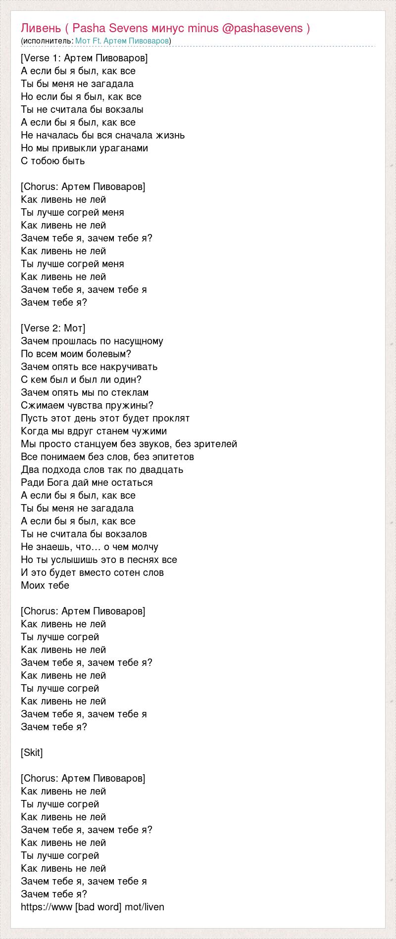 [Verse 1: Артем Пивоваров] А если бы я был, как все Ты бы меня не загадала Но если бы я был, как все Ты не считала бы вокзалы А если бы я был, как все Не началась бы вся сначала жизнь Но мы привыкли ураганами С тобою быть [Chorus: Артем Пивоваров] Как ливень не лей Ты лучше согрей меня Как ливень не лей Зачем тебе я, зачем тебе я? Как ливень не лей Ты лучше согрей меня Как ливень не лей Зачем тебе я, зачем тебе я Зачем тебе я? [Verse 2: Мот] Зачем прошлась по насущному По всем моим болевым? Зачем опять все накручивать С кем был и был ли один? Зачем опять мы по стеклам Сжимаем чувства пружины? Пусть этот день этот будет проклят Когда мы вдруг станем чужими Мы просто станцуем без звуков, без зрителей Все понимаем без слов, без эпитетов Два подхода слов так по двадцать Ради Бога дай мне остаться А если бы я был, как все Ты бы меня не загадала А если бы я был, как все Ты не считала бы вокзалов Не знаешь, что… о чем молчу Но ты услышишь это в песнях все И это будет вместо сотен слов Моих тебе [Chorus: Артем Пивоваров] Как ливень не лей Ты лучше согрей Как ливень не лей Зачем тебе я, зачем тебе я? Как ливень не лей Ты лучше согрей Как ливень не лей Зачем тебе я, зачем тебе я Зачем тебе я? [Skit] [Chorus: Артем Пивоваров] Как ливень не лей Ты лучше согрей Как ливень не лей Зачем тебе я, зачем тебе я? Как ливень не лей Ты лучше согрей Как ливень не лей Зачем тебе я, зачем тебе я Зачем тебе я? https://www [bad word] mot/liven