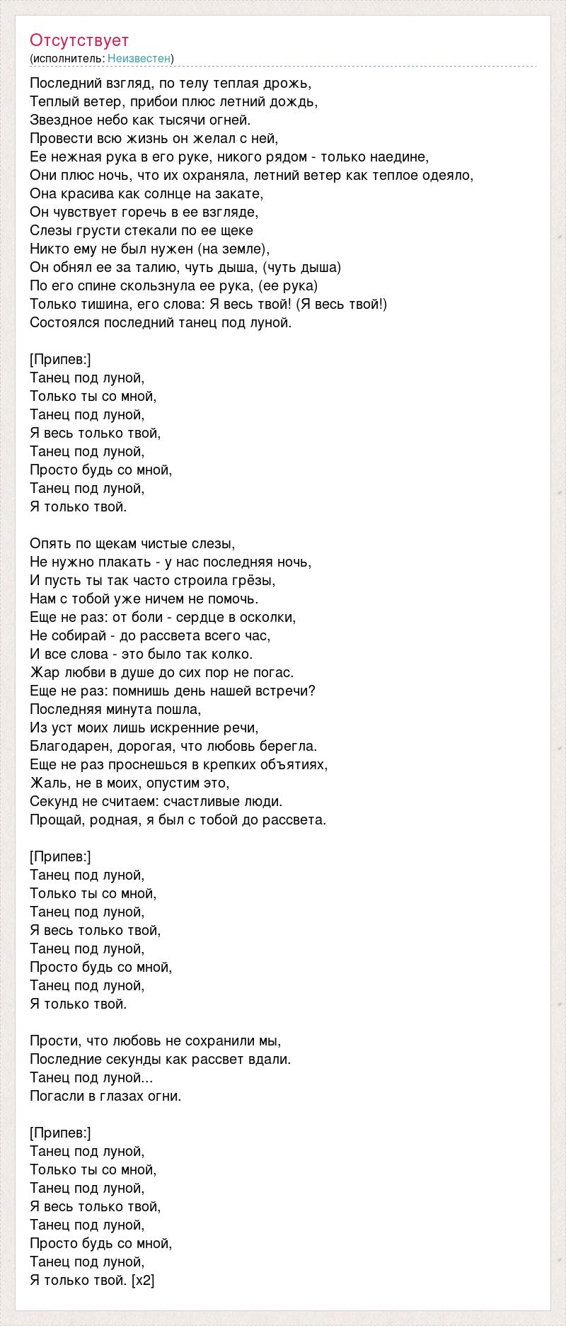 Последний взгляд, по телу теплая дрожь, Теплый ветер, прибои плюс летний дождь, Звездное небо как тысячи огней. Провести всю жизнь он желал с ней, Ее нежная рука в его руке, никого рядом - только наедине, Они плюс ночь, что их охраняла, летний ветер как теплое одеяло, Она красива как солнце на закате, Он чувствует горечь в ее взгляде, Слезы грусти стекали по ее щеке Никто ему не был нужен (на земле), Он обнял ее за талию, чуть дыша, (чуть дыша) По его спине скользнула ее рука, (ее рука) Только тишина, его слова: Я весь твой! (Я весь твой!) Состоялся последний танец под луной. [Припев:] Танец под луной, Только ты со мной, Танец под луной, Я весь только твой, Танец под луной, Просто будь со мной, Танец под луной, Я только твой. Опять по щекам чистые слезы, Не нужно плакать - у нас последняя ночь, И пусть ты так часто строила грёзы, Нам с тобой уже ничем не помочь. Еще не раз: от боли - сердце в осколки, Не собирай - до рассвета всего час, И все слова - это было так колко. Жар любви в душе до сих пор не погас. Еще не раз: помнишь день нашей встречи? Последняя минута пошла, Из уст моих лишь искренние речи, Благодарен, дорогая, что любовь берегла. Еще не раз проснешься в крепких объятиях, Жаль, не в моих, опустим это, Секунд не считаем: счастливые люди. Прощай, родная, я был с тобой до рассвета. [Припев:] Танец под луной, Только ты со мной, Танец под луной, Я весь только твой, Танец под луной, Просто будь со мной, Танец под луной, Я только твой. Прости, что любовь не сохранили мы, Последние секунды как рассвет вдали. Танец под луной... Погасли в глазах огни. [Припев:] Танец под луной, Только ты со мной, Танец под луной, Я весь только твой, Танец под луной, Просто будь со мной, Танец под луной, Я только твой. [х2]