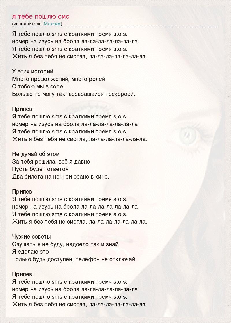 Я тебе пошлю sms с краткими тремя s.o.s. номер на изусь на брола ла-ла-ла-ла-ла-ла-ла Я тебе пошлю sms с краткими тремя s.o.s. Жить я без тебя не смогла, ла-ла-ла-ла-ла-ла-ла. У этих историй Много продолжений, много ролей С тобою мы в соре Больше не могу так, возвращайся поскороей. Припев: Я тебе пошлю sms с краткими тремя s.o.s. номер на изусь на брола ла-ла-ла-ла-ла-ла-ла Я тебе пошлю sms с краткими тремя s.o.s. Жить я без тебя не смогла, ла-ла-ла-ла-ла-ла-ла. Не думай об этом За тебя решила, всё я давно Пусть будет ответом Два билета на ночной сеанс в кино. Припев: Я тебе пошлю sms с краткими тремя s.o.s. номер на изусь на брола ла-ла-ла-ла-ла-ла-ла Я тебе пошлю sms с краткими тремя s.o.s. Жить я без тебя не смогла, ла-ла-ла-ла-ла-ла-ла. Чужие советы Слушать я не буду, надоело так и знай Я сделаю это Только будь доступен, телефон не отключай. Припев: Я тебе пошлю sms с краткими тремя s.o.s. номер на изусь на брола ла-ла-ла-ла-ла-ла-ла Я тебе пошлю sms с краткими тремя s.o.s. Жить я без тебя не смогла, ла-ла-ла-ла-ла-ла-ла.