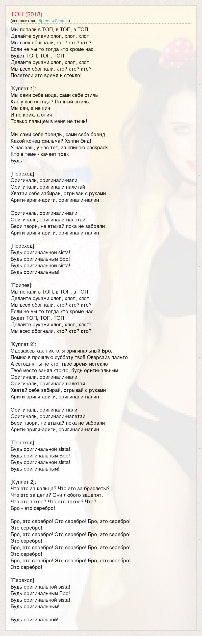Мы попали в ТОП, в ТОП, в ТОП! Делайте руками хлоп, хлоп, хлоп. Мы всех обогнали, кто? кто? кто? Если не мы то тогда кто кроме нас Будет ТОП, ТОП, ТОП! Делайте руками хлоп, хлоп, хлоп. Мы всех обогнали, кто? кто? кто? Полетели это время и стекло! [Куплет 1]: Мы сами себе мода, сами себе стиль Как у вас погода? Полный штиль. Мы кач, а не кич И не крик, а спич Только пальцем в меня не тычь! Мы сами себе тренды, сами себе бренд Какой конец фильма? Хэппи Энд! У нас хэш, у нас тег, за спиною backpack Кто в теме - качает трек Будь! [Переход]: Оригинали, оригинали-нали Оригинали, оригинали налетай Хватай себе забирай, отрывай с руками Ариги-ариги-ариги, оригинали-налин Оригиналь, оригинали-нали Оригиналь, оригинали-налетай Бери твори, не втыкай пока не забрали Ариги-ариги-ариги, оригинали-налин [Переход]: Будь оригинальной sista! Будь оригинальным Бро! Будь оригинальной sista! Будь оригинальным! [Припев]: Мы попали в ТОП, в ТОП, в ТОП! Делайте руками хлоп, хлоп, хлоп. Мы всех обогнали, кто? кто? кто? Если не мы то тогда кто кроме нас Будет ТОП, ТОП, ТОП! Делайте руками хлоп, хлоп, хлоп! Мы всех обогнали, кто? кто? кто? [Куплет 2]: Одеваюсь как никто, я оригинальный Бро, Помню в прошлую субботу твоё Оверсайз пальто А сегодня ты не кто, твоё время истекло Твоё место занял кто-то, будь оригинальным, Оригинали, оригинали-нали Оригинали, оригинали налетай Хватай себе забирай, отрывай с руками Ариги-ариги-ариги, оригинали-налин Оригиналь, оригинали-нали Оригиналь, оригинали-налетай Бери твори, не втыкай пока не забрали Ариги-ариги-ариги, оригинали-налин [Переход]: Будь оригинальной sista! Будь оригинальным Бро! Будь оригинальной sista! Будь оригинальным! [Куплет 2]: Что это за кольца? Что это за браслеты? Что это за цепи? Они любого зацепят. Что это такое? Что это такое? Что? Бро - это серебро! Бро, это серебро! Это серебро! Бро, это серебро! Это серебро! Бро, это серебро! Это серебро! Бро, это серебро! Это серебро! Бро, это серебро! Это серебро! Бро, это серебро! Это серебро! Бро, это серебро! Это серебро! Бро, это серебро! Это серебро! [Переход]: Будь оригинальной sista! Будь оригинальным Бро! Будь оригинальной sista! Будь оригинальным! Будь оригинальной!