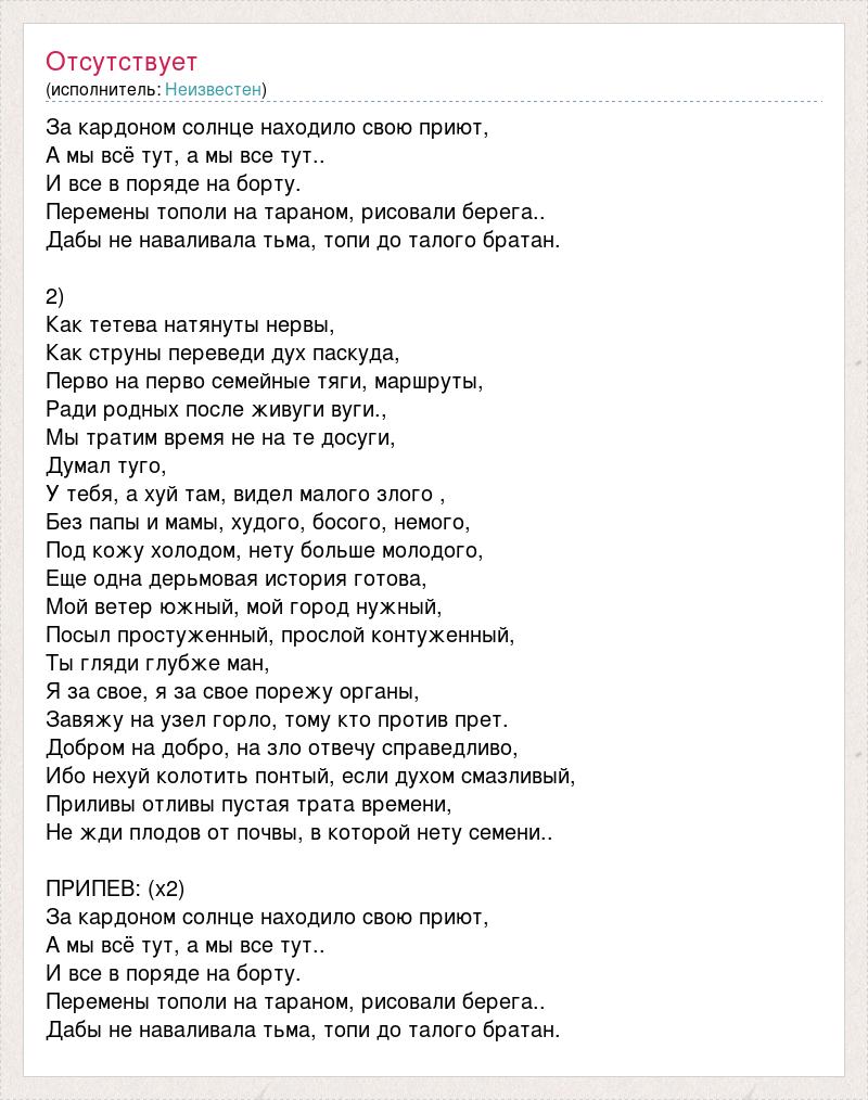 За кардоном солнце находило свою приют, А мы всё тут, а мы все тут.. И все в поряде на борту. Перемены тополи на тараном, рисовали берега.. Дабы не наваливала тьма, топи до талого братан. 2) Как тетева натянуты нервы, Как струны переведи дух паскуда, Перво на перво семейные тяги, маршруты, Ради родных после живуги вуги., Мы тратим время не на те досуги, Думал туго, У тебя, а хуй там, видел малого злого , Без папы и мамы, худого, босого, немого, Под кожу холодом, нету больше молодого, Еще одна дерьмовая история готова, Мой ветер южный, мой город нужный, Посыл простуженный, прослой контуженный, Ты гляди глубже ман, Я за свое, я за свое порежу органы, Завяжу на узел горло, тому кто против прет. Добром на добро, на зло отвечу справедливо, Ибо нехуй колотить понтый, если духом смазливый, Приливы отливы пустая трата времени, Не жди плодов от почвы, в которой нету семени.. ПРИПЕВ: (х2) За кардоном солнце находило свою приют, А мы всё тут, а мы все тут.. И все в поряде на борту. Перемены тополи на тараном, рисовали берега.. Дабы не наваливала тьма, топи до талого братан.