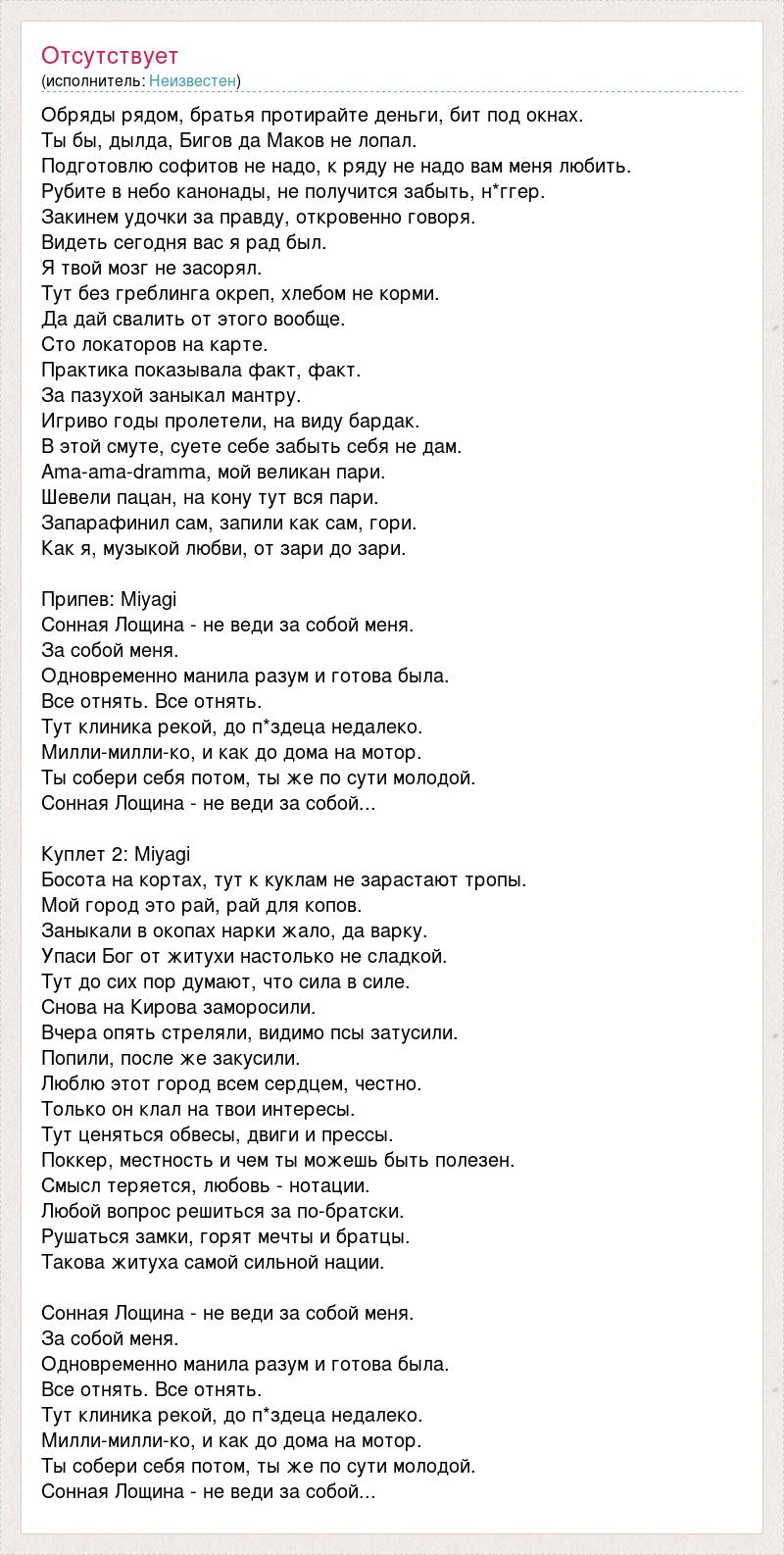 Обряды рядом, братья протирайте деньги, бит под окнах. Ты бы, дылда, Бигов да Маков не лопал. Подготовлю софитов не надо, к ряду не надо вам меня любить. Рубите в небо канонады, не получится забыть, н*ггер. Закинем удочки за правду, откровенно говоря. Видеть сегодня вас я рад был. Я твой мозг не засорял. Тут без греблинга окреп, хлебом не корми. Да дай свалить от этого вообще. Сто локаторов на карте. Практика показывала факт, факт. За пазухой заныкал мантру. Игриво годы пролетели, на виду бардак. В этой смуте, суете себе забыть себя не дам. Ama-ama-dramma, мой великан пари. Шевели пацан, на кону тут вся пари. Запарафинил сам, запили как сам, гори. Как я, музыкой любви, от зари до зари. Припев: Miyagi Сонная Лощина - не веди за собой меня. За собой меня. Одновременно манила разум и готова была. Все отнять. Все отнять. Тут клиника рекой, до п*здеца недалеко. Милли-милли-ко, и как до дома на мотор. Ты собери себя потом, ты же по сути молодой. Сонная Лощина - не веди за собой... Куплет 2: Miyagi Босота на кортах, тут к куклам не зарастают тропы. Мой город это рай, рай для копов. Заныкали в окопах нарки жало, да варку. Упаси Бог от житухи настолько не сладкой. Тут до сих пор думают, что сила в силе. Снова на Кирова заморосили. Вчера опять стреляли, видимо псы затусили. Попили, после же закусили. Люблю этот город всем сердцем, честно. Только он клал на твои интересы. Тут ценяться обвесы, двиги и прессы. Поккер, местность и чем ты можешь быть полезен. Смысл теряется, любовь - нотации. Любой вопрос решиться за по-братски. Рушаться замки, горят мечты и братцы. Такова житуха самой сильной нации. Сонная Лощина - не веди за собой меня. За собой меня. Одновременно манила разум и готова была. Все отнять. Все отнять. Тут клиника рекой, до п*здеца недалеко. Милли-милли-ко, и как до дома на мотор. Ты собери себя потом, ты же по сути молодой. Сонная Лощина - не веди за собой...