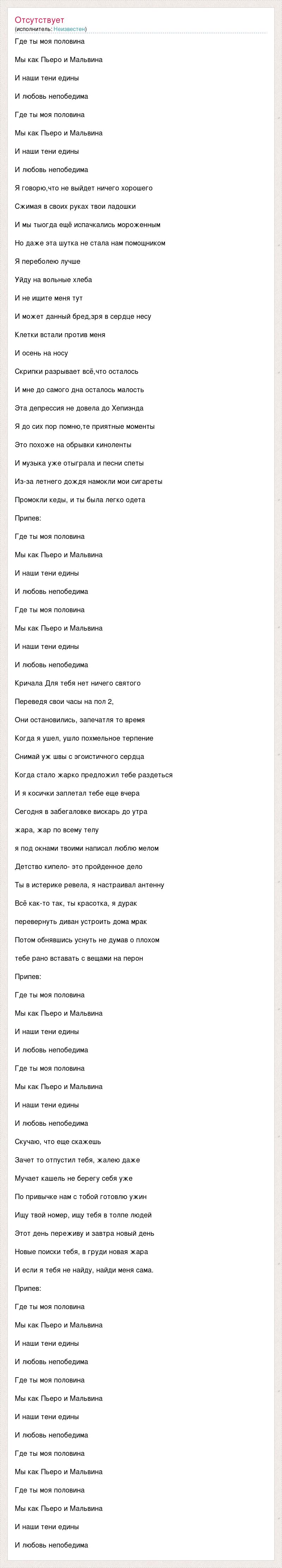 Где ты моя половина Мы как Пьеро и Мальвина И наши тени едины И любовь непобедима Где ты моя половина Мы как Пьеро и Мальвина И наши тени едины И любовь непобедима Я говорю,что не выйдет ничего хорошего Сжимая в своих руках твои ладошки И мы тыогда ещё испачкались мороженным Но даже эта шутка не стала нам помощником Я переболею лучше Уйду на вольные хлеба И не ищите меня тут И может данный бред,зря в сердце несу Клетки встали против меня И осень на носу Скрипки разрывает всё,что осталось И мне до самого дна осталось малость Эта депрессия не довела до Хепиэнда Я до сих пор помню,те приятные моменты Это похоже на обрывки киноленты И музыка уже отыграла и песни спеты Из-за летнего дождя намокли мои сигареты Промокли кеды, и ты была легко одета Припев: Где ты моя половина Мы как Пьеро и Мальвина И наши тени едины И любовь непобедима Где ты моя половина Мы как Пьеро и Мальвина И наши тени едины И любовь непобедима Кричала Для тебя нет ничего святого Переведя свои часы на пол 2, Они остановились, запечатля то время Когда я ушел, ушло похмельное терпение Снимай уж швы с эгоистичного сердца Когда стало жарко предложил тебе раздеться И я косички заплетал тебе еще вчера Сегодня в забегаловке вискарь до утра жара, жар по всему телу я под окнами твоими написал люблю мелом Детство кипело- это пройденное дело Ты в истерике ревела, я настраивал антенну Всё как-то так, ты красотка, я дурак перевернуть диван устроить дома мрак Потом обнявшись уснуть не думав о плохом тебе рано вставать с вещами на перон Припев: Где ты моя половина Мы как Пьеро и Мальвина И наши тени едины И любовь непобедима Где ты моя половина Мы как Пьеро и Мальвина И наши тени едины И любовь непобедима Скучаю, что еще скажешь Зачет то отпустил тебя, жалею даже Мучает кашель не берегу себя уже По привычке нам с тобой готовлю ужин Ищу твой номер, ищу тебя в толпе людей Этот день переживу и завтра новый день Новые поиски тебя, в груди новая жара И если я тебя не найду, найди меня сама. Припев: Где ты моя половина Мы как Пьеро и Мальвина И наши тени едины И любовь непобедима Где ты моя половина Мы как Пьеро и Мальвина И наши тени едины И любовь непобедима Где ты моя половина Мы как Пьеро и Мальвина Где ты моя половина Мы как Пьеро и Мальвина И наши тени едины И любовь непобедима