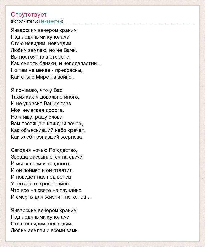 Январским вечером храним Под ледяными куполами Стою невидим, невредим. Любим землею, но не Вами. Вы постоянно в стороне, Как смерть близки, и неподвластны... Но тем не менее - прекрасны, Как сны о Мире на войне . Я понимаю, что у Вас Таких как я довольно много, И не украсит Ваших глаз Моя нелегкая дорога. Но я ищу, ращу слова, Вам посвящаю каждый вечер, Как объяснивший небо кречет, Как хлеб познавший жернова. Сегодня ночью Рождество, Звезда рассыплется на свечи И мы сольемся в одного, И он поймет и он ответит. И поведет нас под венец У алтаря откроет тайны, Что все на свете не случайно И смерть для жизни - не конец... Январским вечером храним Под ледяными куполами Стою невидим, невредим. Любим землей и всеми вами.