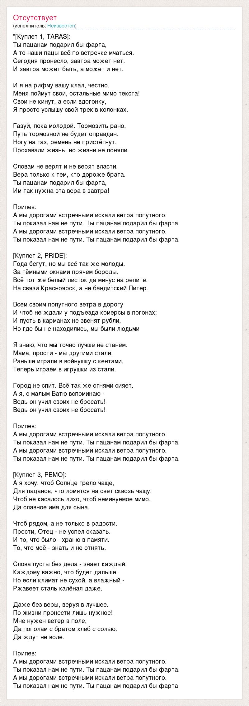 "[Куплет 1, TARAS]: Ты пацанам подарил бы фарта, А то наши пацы всё по встречке мчаться. Сегодня пронесло, завтра может нет. И завтра может быть, а может и нет. И я на рифму вашу клал, честно. Меня поймут свои, остальные мимо текста! Свои не кинут, а если вдогонку, Я просто услышу свой трек в колонках. Газуй, пока молодой. Тормозить рано. Путь тормозной не будет оправдан. Ногу на газ, ремень не пристёгнут. Прохавали жизнь, но жизни не поняли. Словам не верят и не верят власти. Вера только к тем, кто дороже брата. Ты пацанам подарил бы фарта, Им так нужна эта вера в завтра! Припев: А мы дорогами встречными искали ветра попутного. Ты показал нам не пути. Ты пацанам подарил бы фарта. А мы дорогами встречными искали ветра попутного. Ты показал нам не пути. Ты пацанам подарил бы фарта. [Куплет 2, PRIDE]: Года бегут, но мы всё так же молоды. За тёмными окнами прячем бороды. Всё тот же белый листок да минус на репите. На связи Красноярск, а не бандитский Питер. Всем своим попутного ветра в дорогу И чтоб не ждали у подъезда комерсы в погонах; И пусть в карманах не звенят рубли, Но где бы не находились, мы были людьми Я знаю, что мы точно лучше не станем. Мама, прости - мы другими стали. Раньше играли в войнушку с кентами, Теперь играем в игрушки из стали. Город не спит. Всё так же огнями сияет. А я, с малым Батю вспоминаю - Ведь он учил своих не бросать! Ведь он учил своих не бросать! Припев: А мы дорогами встречными искали ветра попутного. Ты показал нам не пути. Ты пацанам подарил бы фарта. А мы дорогами встречными искали ветра попутного. Ты показал нам не пути. Ты пацанам подарил бы фарта. [Куплет 3, РЕМО]: А я хочу, чтоб Солнце грело чаще, Для пацанов, что ломятся на свет сквозь чащу. Чтоб не касалось лихо, чтоб неминуемое мимо. Да славное имя для сына. Чтоб рядом, а не только в радости. Прости, Отец - не успел сказать. И то, что было - храню в памяти. То, что моё - знать и не отнять. Слова пусты без дела - знает каждый. Каждому важно, что будет дальше. Но если климат не сухой, а влажный - Ржавеет сталь калёная даже. Даже без веры, веруя в лучшее. По жизни пронести лишь нужное! Мне нужен ветер в поле, Да пополам с братом хлеб с солью. Да ждут не воле. Припев: А мы дорогами встречными искали ветра попутного. Ты показал нам не пути. Ты пацанам подарил бы фарта. А мы дорогами встречными искали ветра попутного. Ты показал нам не пути. Ты пацанам подарил бы фарта