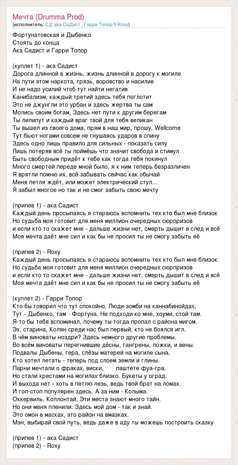 Фортунатовская и Дыбенко Стоять до конца Ака Садист и Гарри Топор (куплет 1) - ака Садист Дорога длинной в жизнь, жизнь длинной в дорогу к могиле На пути этом наркота, грязь, воровство и насилие И не надо усилий чтоб тут найти негатив Канибализм, каждый третий здесь тебя поглотит Это не джунгли это урбан и здесь жертва ты сам Молись своим богам, Здесь нет пути к другим берегам Ты лилипут и каждый враг твой для тебя великан Ты вышел из своего дома, прям в наш мир, прошу, Wellcome Тут бьют ногами совсем не гнушаясь ударов в спину Здесь одно лишь правило для сильных - показать силу Лишь потеряв всё ты поймёшь что значит свобода и стимул Быть свободным придёт к тебе как тогда тебя покинул Много смертей переде мной было, я к ним теперь безразличен Я врятли помню их, всё забывать сейчас как обычай Меня петля ждёт, или может электрический стул... Я забыл многое но так и не смог забыть свою мечту (припев 1) - ака Садист Каждый день просыпаясь я стараюсь вспомнить тех кто был мне близок Но судьба моя готовит для меня миллион очередных сюрпризов и если кто то скажет мне - дальше жизни нет, смерть дышит в след и всё Моя мечта даёт мне сил и как бы не просил ты не смогу забыть её (припев 2) - Roxy Каждый день просыпаясь я стараюсь вспомнить тех кто был мне близок Но судьба моя готовит для меня миллион очередных сюрпризов и если кто то скажет мне - дальше жизни нет, смерть дышит в след и всё Моя мечта даёт мне сил и как бы не просил ты не смогу забыть её (куплет 2) - Гарри Топор Кто бы говорил что тут спокойно. Люди-зомби на каннабинойдах, Тут - Дыбенко, там - Фортуна. Не подходи ко мне, хоуми, стой там. Я-то бы тебя вспоминал, почему ты тогда пропал с района мигом. Эх, старина, Колян среди нас был первый, кто не боялся игл. В чём виноваты ноздри? Здесь немного другие проблемы. Во всём виноваты перегнившие дёсны, гангрены, ложки, и вены. Подвалы Дыбены, гера, слёзы матерей на могиле сына. Кто хотел летать - теперь под слоем земли и глины. Парни мечтали о фраках, виски, паштете фуа-гра. Но стали крестами на могилах близко. Букеты у оград. И выхода нет - хоть в петлю лезь, ведь твой брат на ломах. И гоп-стоп популярен здесь. А за ним - Колыма. Оккервиль, Коллонтай. Эти места знают много тайн. Но они меня пленили. Здесь мой дом - так и знай. Это омон в масках, это район на вмазках. Мэн, выбирай свой путь, ведь даже в аду ты можешь построить сказку (припев 1) - ака Садист (припев 2) - Roxy