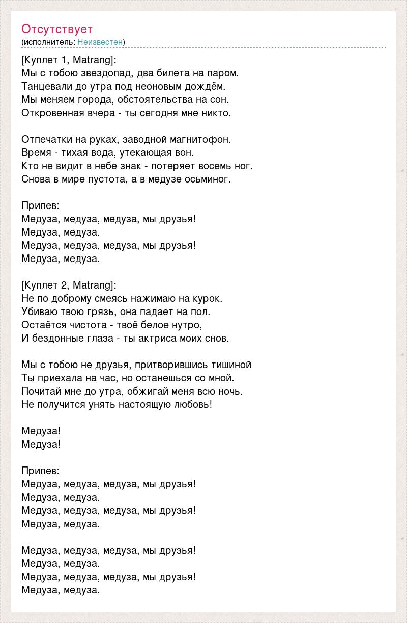 [Куплет 1, Matrang]: Мы с тобою звездопад, два билета на паром. Танцевали до утра под неоновым дождём. Мы меняем города, обстоятельства на сон. Откровенная вчера - ты сегодня мне никто. Отпечатки на руках, заводной магнитофон. Время - тихая вода, утекающая вон. Кто не видит в небе знак - потеряет восемь ног. Снова в мире пустота, а в медузе осьминог. Припев: Медуза, медуза, медуза, мы друзья! Медуза, медуза. Медуза, медуза, медуза, мы друзья! Медуза, медуза. [Куплет 2, Matrang]: Не по доброму смеясь нажимаю на курок. Убиваю твою грязь, она падает на пол. Остаётся чистота - твоё белое нутро, И бездонные глаза - ты актриса моих снов. Мы с тобою не друзья, притворившись тишиной Ты приехала на час, но останешься со мной. Почитай мне до утра, обжигай меня всю ночь. Не получится унять настоящую любовь! Медуза! Медуза! Припев: Медуза, медуза, медуза, мы друзья! Медуза, медуза. Медуза, медуза, медуза, мы друзья! Медуза, медуза. Медуза, медуза, медуза, мы друзья! Медуза, медуза. Медуза, медуза, медуза, мы друзья! Медуза, медуза.