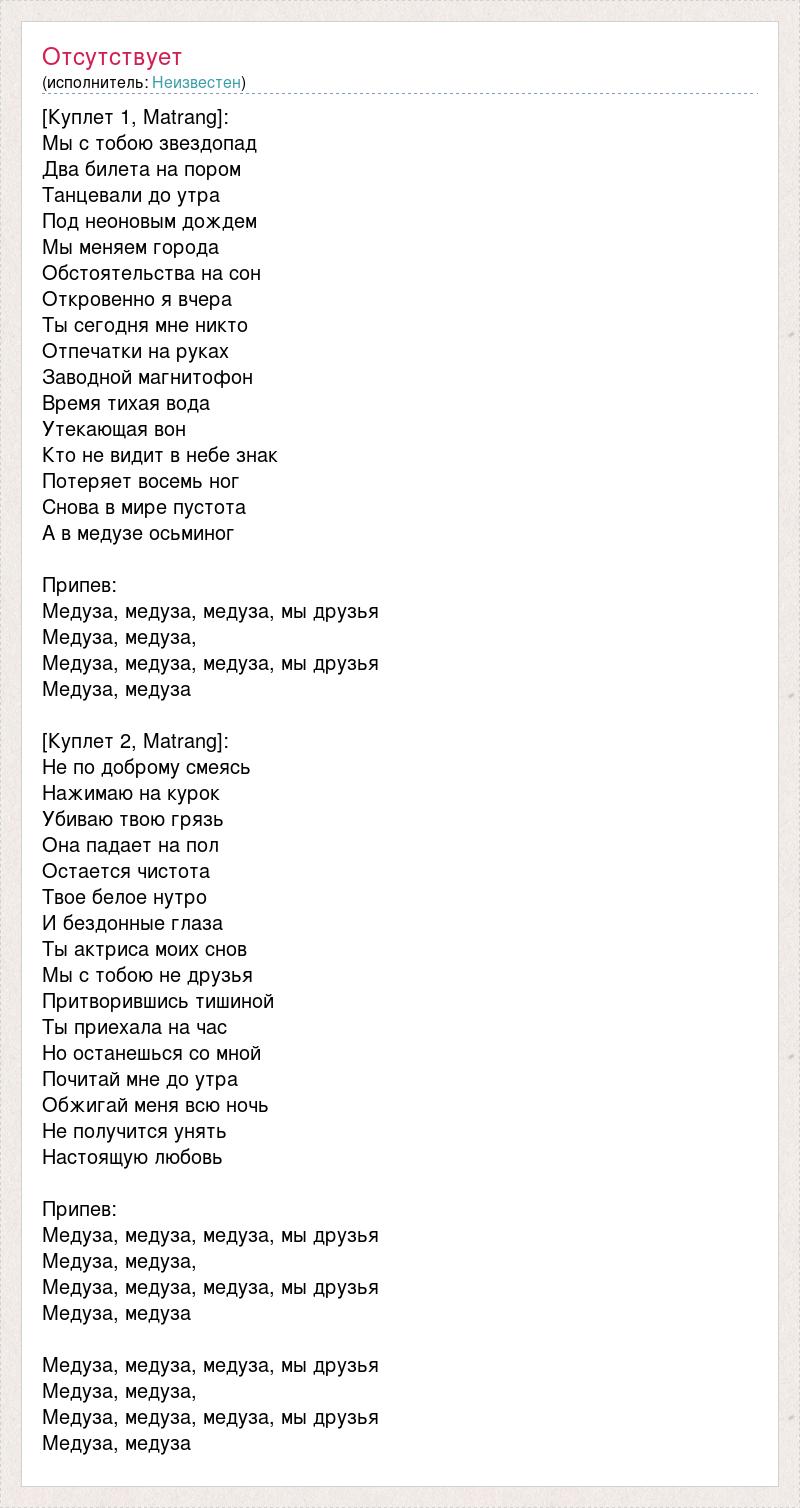 [Куплет 1, Matrang]: Мы с тобою звездопад Два билета на пором Танцевали до утра Под неоновым дождем Мы меняем города Обстоятельства на сон Откровенно я вчера Ты сегодня мне никто Отпечатки на руках Заводной магнитофон Время тихая вода Утекающая вон Кто не видит в небе знак Потеряет восемь ног Снова в мире пустота А в медузе осьминог Припев: Медуза, медуза, медуза, мы друзья Медуза, медуза, Медуза, медуза, медуза, мы друзья Медуза, медуза [Куплет 2, Matrang]: Не по доброму смеясь Нажимаю на курок Убиваю твою грязь Она падает на пол Остается чистота Твое белое нутро И бездонные глаза Ты актриса моих снов Мы с тобою не друзья Притворившись тишиной Ты приехала на час Но останешься со мной Почитай мне до утра Обжигай меня всю ночь Не получится унять Настоящую любовь Припев: Медуза, медуза, медуза, мы друзья Медуза, медуза, Медуза, медуза, медуза, мы друзья Медуза, медуза Медуза, медуза, медуза, мы друзья Медуза, медуза, Медуза, медуза, медуза, мы друзья Медуза, медуза