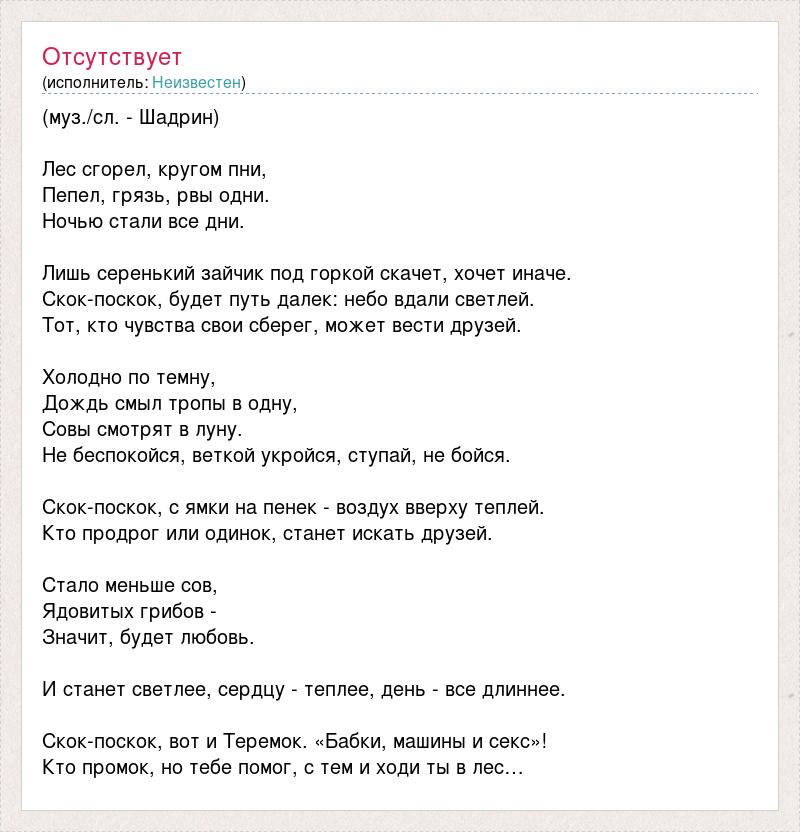 (муз./сл. - Шадрин) Лес сгорел, кругом пни, Пепел, грязь, рвы одни. Ночью стали все дни. Лишь серенький зайчик под горкой скачет, хочет иначе. Скок-поскок, будет путь далек: небо вдали светлей. Тот, кто чувства свои сберег, может вести друзей. Холодно по темну, Дождь смыл тропы в одну, Совы смотрят в луну. Не беспокойся, веткой укройся, ступай, не бойся. Скок-поскок, с ямки на пенек - воздух вверху теплей. Кто продрог или одинок, станет искать друзей. Стало меньше сов, Ядовитых грибов - Значит, будет любовь. И станет светлее, сердцу - теплее, день - все длиннее. Скок-поскок, вот и Теремок. «Бабки, машины и секс»! Кто промок, но тебе помог, с тем и ходи ты в лес…