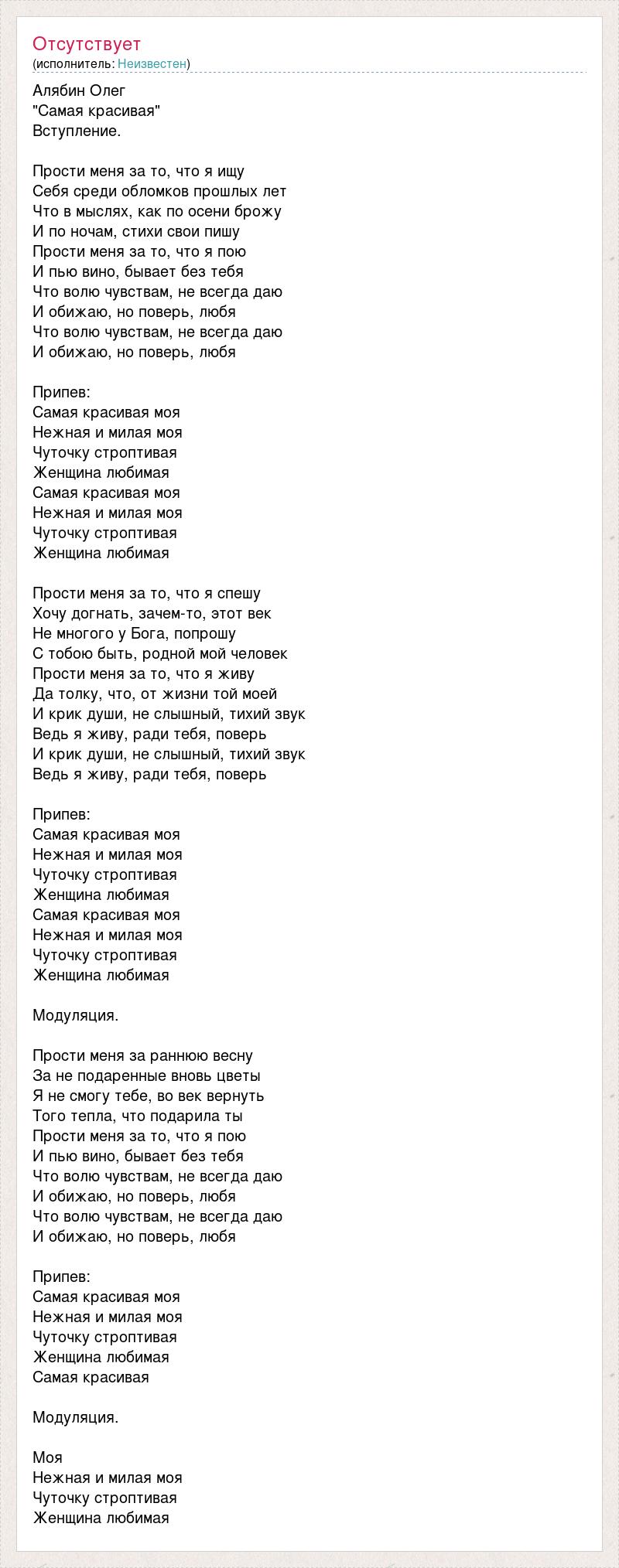 Алябин Олег "Самая красивая" Вступление. Прости меня за то, что я ищу Себя среди обломков прошлых лет Что в мыслях, как по осени брожу И по ночам, стихи свои пишу Прости меня за то, что я пою И пью вино, бывает без тебя Что волю чувствам, не всегда даю И обижаю, но поверь, любя Что волю чувствам, не всегда даю И обижаю, но поверь, любя Припев: Самая красивая моя Нежная и милая моя Чуточку строптивая Женщина любимая Самая красивая моя Нежная и милая моя Чуточку строптивая Женщина любимая Прости меня за то, что я спешу Хочу догнать, зачем-то, этот век Не многого у Бога, попрошу С тобою быть, родной мой человек Прости меня за то, что я живу Да толку, что, от жизни той моей И крик души, не слышный, тихий звук Ведь я живу, ради тебя, поверь И крик души, не слышный, тихий звук Ведь я живу, ради тебя, поверь Припев: Самая красивая моя Нежная и милая моя Чуточку строптивая Женщина любимая Самая красивая моя Нежная и милая моя Чуточку строптивая Женщина любимая Модуляция. Прости меня за раннюю весну За не подаренные вновь цветы Я не смогу тебе, во век вернуть Того тепла, что подарила ты Прости меня за то, что я пою И пью вино, бывает без тебя Что волю чувствам, не всегда даю И обижаю, но поверь, любя Что волю чувствам, не всегда даю И обижаю, но поверь, любя Припев: Самая красивая моя Нежная и милая моя Чуточку строптивая Женщина любимая Самая красивая Модуляция. Моя Нежная и милая моя Чуточку строптивая Женщина любимая