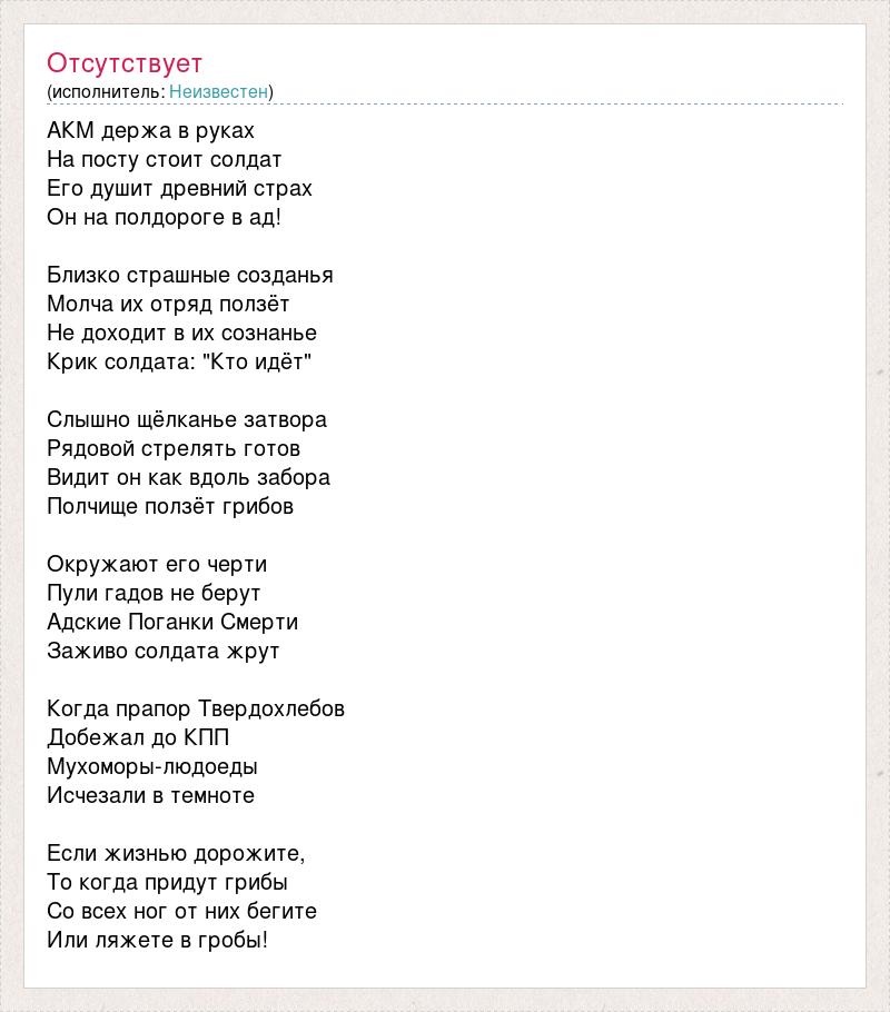 АКМ держа в руках На посту стоит солдат Его душит древний страх Он на полдороге в ад! Близко страшные созданья Молча их отряд ползёт Не доходит в их сознанье Крик солдата: "Кто идёт" Слышно щёлканье затвора Рядовой стрелять готов Видит он как вдоль забора Полчище ползёт грибов Окружают его черти Пули гадов не берут Адские Поганки Смерти Заживо солдата жрут Когда прапор Твердохлебов Добежал до КПП Мухоморы-людоеды Исчезали в темноте Если жизнью дорожите, То когда придут грибы Со всех ног от них бегите Или ляжете в гробы!