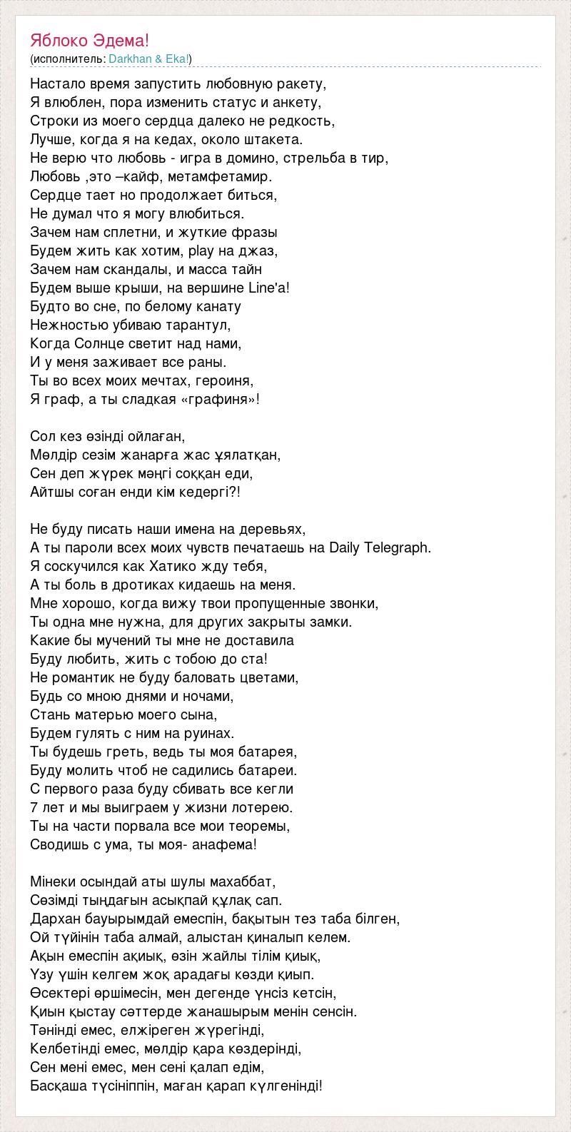 Настало время запустить любовную ракету, Я влюблен, пора изменить статус и анкету, Строки из моего сердца далеко не редкость, Лучше, когда я на кедах, около штакета. Не верю что любовь - игра в домино, стрельба в тир, Любовь ,это –кайф, метамфетамир. Сердце тает но продолжает биться, Не думал что я могу влюбиться. Зачем нам сплетни, и жуткие фразы Будем жить как хотим, play на джаз, Зачем нам скандалы, и масса тайн Будем выше крыши, на вершине Line'а! Будто во сне, по белому канату Нежностью убиваю тарантул, Когда Солнце светит над нами, И у меня заживает все раны. Ты во всех моих мечтах, героиня, Я граф, а ты сладкая «графиня»! Сол кез өзінді ойлаған, Мөлдір сезім жанарға жас ұялатқан, Сен деп жүрек мәңгі соққан еди, Айтшы соған енди кім кедергі?! Не буду писать наши имена на деревьях, А ты пароли всех моих чувств печатаешь на Daily Telegraph. Я соскучился как Хатико жду тебя, А ты боль в дротиках кидаешь на меня. Мне хорошо, когда вижу твои пропущенные звонки, Ты одна мне нужна, для других закрыты замки. Какие бы мучений ты мне не доставила Буду любить, жить с тобою до ста! Не романтик не буду баловать цветами, Будь со мною днями и ночами, Стань матерью моего сына, Будем гулять с ним на руинах. Ты будешь греть, ведь ты моя батарея, Буду молить чтоб не садились батареи. С первого раза буду сбивать все кегли 7 лет и мы выиграем у жизни лотерею. Ты на части порвала все мои теоремы, Сводишь с ума, ты моя- анафема! Мінеки осындай аты шулы махаббат, Сөзімді тыңдағын асықпай құлақ сап. Дархан бауырымдай емеспін, бақытын тез таба білген, Ой түйінін таба алмай, алыстан қиналып келем. Ақын емеспін ақиық, өзін жайлы тілім қиық, Үзу үшін келгем жоқ арадағы көзди қиып. Өсектері өршімесін, мен дегенде үнсіз кетсін, Қиын қыстау сәттерде жанашырым менін сенсін. Тәнінді емес, елжіреген жүрегінді, Келбетінді емес, мөлдір қара көздерінді, Сен мені емес, мен сені қалап едім, Басқаша түсініппін, маған қарап күлгенінді!