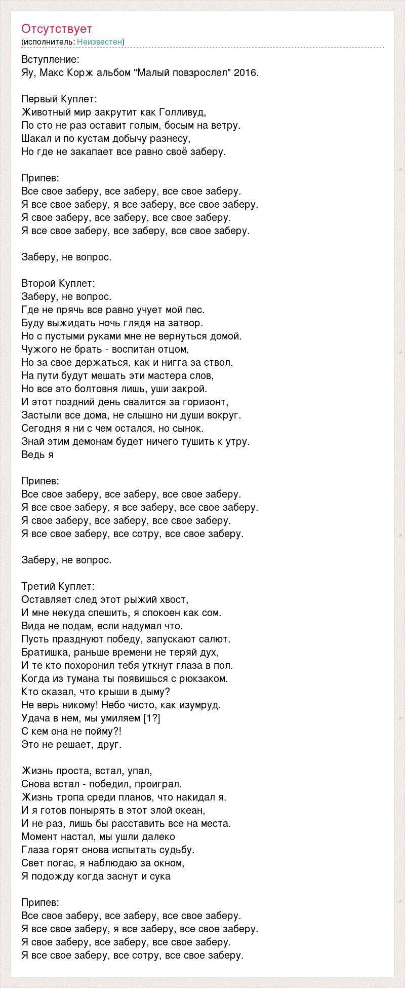 Вступление: Яу, Макс Корж альбом "Малый повзрослел" 2016. Первый Куплет: Животный мир закрутит как Голливуд, По сто не раз оставит голым, босым на ветру. Шакал и по кустам добычу разнесу, Но где не закапает все равно своё заберу. Припев: Все свое заберу, все заберу, все свое заберу. Я все свое заберу, я все заберу, все свое заберу. Я свое заберу, все заберу, все свое заберу. Я все свое заберу, все заберу, все свое заберу. Заберу, не вопрос. Второй Куплет: Заберу, не вопрос. Где не прячь все равно учует мой пес. Буду выжидать ночь глядя на затвор. Но с пустыми руками мне не вернуться домой. Чужого не брать - воспитан отцом, Но за свое держаться, как и нигга за ствол. На пути будут мешать эти мастера слов, Но все это болтовня лишь, уши закрой. И этот поздний день свалится за горизонт, Застыли все дома, не слышно ни души вокруг. Сегодня я ни с чем остался, но сынок. Знай этим демонам будет ничего тушить к утру. Ведь я Припев: Все свое заберу, все заберу, все свое заберу. Я все свое заберу, я все заберу, все свое заберу. Я свое заберу, все заберу, все свое заберу. Я все свое заберу, все сотру, все свое заберу. Заберу, не вопрос. Третий Куплет: Оставляет след этот рыжий хвост, И мне некуда спешить, я спокоен как сом. Вида не подам, если надумал что. Пусть празднуют победу, запускают салют. Братишка, раньше времени не теряй дух, И те кто похоронил тебя уткнут глаза в пол. Когда из тумана ты появишься с рюкзаком. Кто сказал, что крыши в дыму? Не верь никому! Небо чисто, как изумруд. Удача в нем, мы умиляем [1?] С кем она не пойму?! Это не решает, друг. Жизнь проста, встал, упал, Снова встал - победил, проиграл. Жизнь тропа среди планов, что накидал я. И я готов понырять в этот злой океан, И не раз, лишь бы расставить все на места. Момент настал, мы ушли далеко Глаза горят снова испытать судьбу. Свет погас, я наблюдаю за окном, Я подожду когда заснут и сука Припев: Все свое заберу, все заберу, все свое заберу. Я все свое заберу, я все заберу, все свое заберу. Я свое заберу, все заберу, все свое заберу. Я все свое заберу, все сотру, все свое заберу.