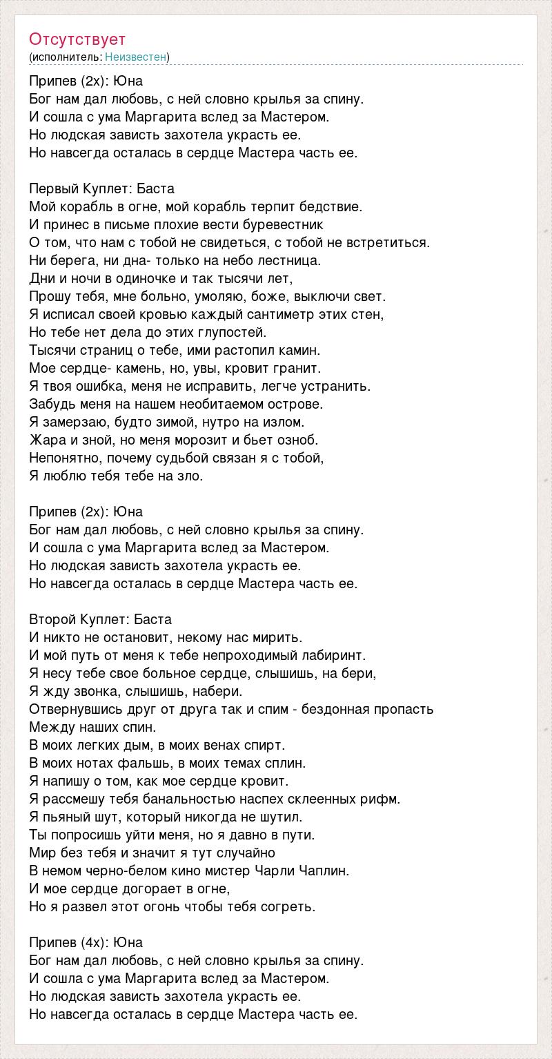 Припев (2x): Юна Бог нам дал любовь, с ней словно крылья за спину. И сошла с ума Маргарита вслед за Мастером. Но людская зависть захотела украсть ее. Но навсегда осталась в сердце Мастера часть ее. Первый Куплет: Баста Мой корабль в огне, мой корабль терпит бедствие. И принес в письме плохие вести буревестник О том, что нам с тобой не свидеться, с тобой не встретиться. Ни берега, ни дна- только на небо лестница. Дни и ночи в одиночке и так тысячи лет, Прошу тебя, мне больно, умоляю, боже, выключи свет. Я исписал своей кровью каждый сантиметр этих стен, Но тебе нет дела до этих глупостей. Тысячи страниц о тебе, ими растопил камин. Мое сердце- камень, но, увы, кровит гранит. Я твоя ошибка, меня не исправить, легче устранить. Забудь меня на нашем необитаемом острове. Я замерзаю, будто зимой, нутро на излом. Жара и зной, но меня морозит и бьет озноб. Непонятно, почему судьбой связан я с тобой, Я люблю тебя тебе на зло. Припев (2x): Юна Бог нам дал любовь, с ней словно крылья за спину. И сошла с ума Маргарита вслед за Мастером. Но людская зависть захотела украсть ее. Но навсегда осталась в сердце Мастера часть ее. Второй Куплет: Баста И никто не остановит, некому нас мирить. И мой путь от меня к тебе непроходимый лабиринт. Я несу тебе свое больное сердце, слышишь, на бери, Я жду звонка, слышишь, набери. Отвернувшись друг от друга так и спим - бездонная пропасть Между наших спин. В моих легких дым, в моих венах спирт. В моих нотах фальшь, в моих темах сплин. Я напишу о том, как мое сердце кровит. Я рассмешу тебя банальностью наспех склеенных рифм. Я пьяный шут, который никогда не шутил. Ты попросишь уйти меня, но я давно в пути. Мир без тебя и значит я тут случайно В немом черно-белом кино мистер Чарли Чаплин. И мое сердце догорает в огне, Но я развел этот огонь чтобы тебя согреть. Припев (4x): Юна Бог нам дал любовь, с ней словно крылья за спину. И сошла с ума Маргарита вслед за Мастером. Но людская зависть захотела украсть ее. Но навсегда осталась в сердце Мастера часть ее.
