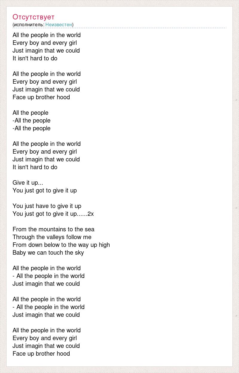 All the people in the world Every boy and every girl Just imagin that we could It isn't hard to do All the people in the world Every boy and every girl Just imagin that we could Face up brother hood All the people -All the people -All the people All the people in the world Every boy and every girl Just imagin that we could It isn't hard to do Give it up... You just got to give it up You just have to give it up You just got to give it up......2x From the mountains to the sea Through the valleys follow me From down below to the way up high Baby we can touch the sky All the people in the world - All the people in the world Just imagin that we could All the people in the world - All the people in the world Just imagin that we could All the people in the world Every boy and every girl Just imagin that we could Face up brother hood