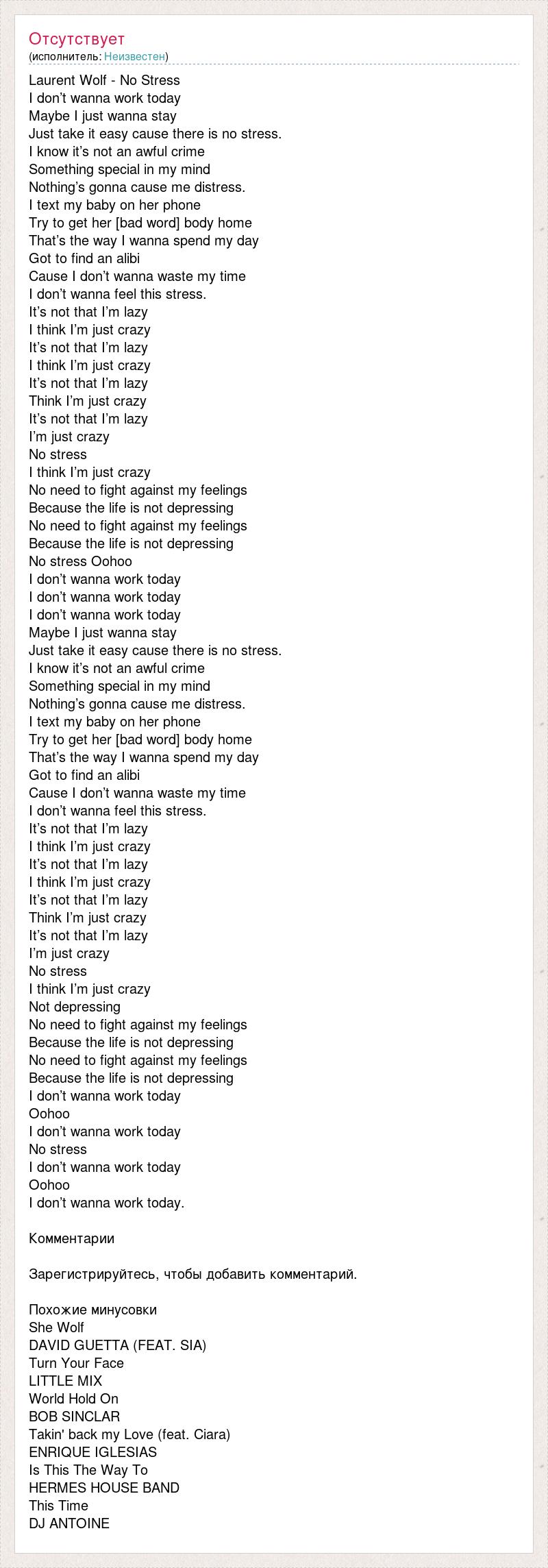Laurent Wolf - No Stress I don’t wanna work today Maybe I just wanna stay Just take it easy cause there is no stress. I know it’s not an awful crime Something special in my mind Nothing’s gonna cause me distress. I text my baby on her phone Try to get her [bad word] body home That’s the way I wanna spend my day Got to find an alibi Cause I don’t wanna waste my time I don’t wanna feel this stress. It’s not that I’m lazy I think I’m just crazy It’s not that I’m lazy I think I’m just crazy It’s not that I’m lazy Think I’m just crazy It’s not that I’m lazy I’m just crazy No stress I think I’m just crazy No need to fight against my feelings Because the life is not depressing No need to fight against my feelings Because the life is not depressing No stress Oohoo I don’t wanna work today I don’t wanna work today I don’t wanna work today Maybe I just wanna stay Just take it easy cause there is no stress. I know it’s not an awful crime Something special in my mind Nothing’s gonna cause me distress. I text my baby on her phone Try to get her [bad word] body home That’s the way I wanna spend my day Got to find an alibi Cause I don’t wanna waste my time I don’t wanna feel this stress. It’s not that I’m lazy I think I’m just crazy It’s not that I’m lazy I think I’m just crazy It’s not that I’m lazy Think I’m just crazy It’s not that I’m lazy I’m just crazy No stress I think I’m just crazy Not depressing No need to fight against my feelings Because the life is not depressing No need to fight against my feelings Because the life is not depressing I don’t wanna work today Oohoo I don’t wanna work today No stress I don’t wanna work today Oohoo I don’t wanna work today. Комментарии Зарегистрируйтесь, чтобы добавить комментарий. Похожие минусовки She Wolf DAVID GUETTA (FEAT. SIA) Turn Your Face LITTLE MIX World Hold On BOB SINCLAR Takin' back my Love (feat. Ciara) ENRIQUE IGLESIAS Is This The Way To HERMES HOUSE BAND This Time DJ ANTOINE