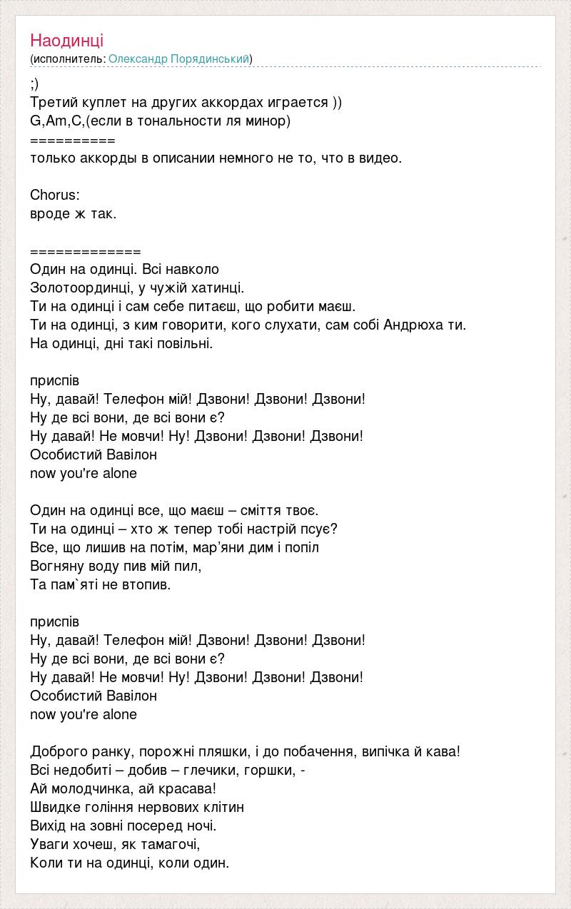 ;) Третий куплет на других аккордах играется )) G,Am,C,(если в тональности ля минор) ========== только аккорды в описании немного не то, что в видео. Chorus: вроде ж так. ============= Один на одинці. Всі навколо Золотоординці, у чужій хатинці. Ти на одинці і сам себе питаєш, що робити маєш. Ти на одинці, з ким говорити, кого слухати, сам собі Андрюха ти. На одинці, дні такі повільні. приспів Ну, давай! Телефон мій! Дзвони! Дзвони! Дзвони! Ну де всі вони, де всі вони є? Ну давай! Не мовчи! Ну! Дзвони! Дзвони! Дзвони! Особистий Вавілон now you're alone Один на одинці все, що маєш – сміття твоє. Ти на одинці – хто ж тепер тобі настрій псує? Все, що лишив на потім, мар’яни дим i попiл Вогняну воду пив мій пил, Та пам`яті не втопив. приспів Ну, давай! Телефон мій! Дзвони! Дзвони! Дзвони! Ну де всі вони, де всі вони є? Ну давай! Не мовчи! Ну! Дзвони! Дзвони! Дзвони! Особистий Вавілон now you're alone Доброго ранку, порожні пляшки, і до побачення, випічка й кава! Всі недобиті – добив – глечики, горшки, - Ай молодчинка, ай красава! Швидке гоління нервових клітин Вихід на зовні посеред ночі. Уваги хочеш, як тамагочі, Коли ти на одинці, коли один.