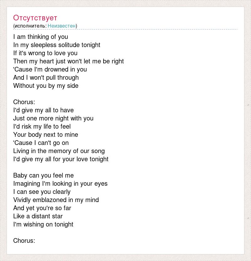 I am thinking of you In my sleepless solitude tonight If it's wrong to love you Then my heart just won't let me be right 'Cause I'm drowned in you And I won't pull through Without you by my side Chorus: I'd give my all to have Just one more night with you I'd risk my life to feel Your body next to mine 'Cause I can't go on Living in the memory of our song I'd give my all for your love tonight Baby can you feel me Imagining I'm looking in your eyes I can see you clearly Vividly emblazoned in my mind And yet you're so far Like a distant star I'm wishing on tonight Chorus: